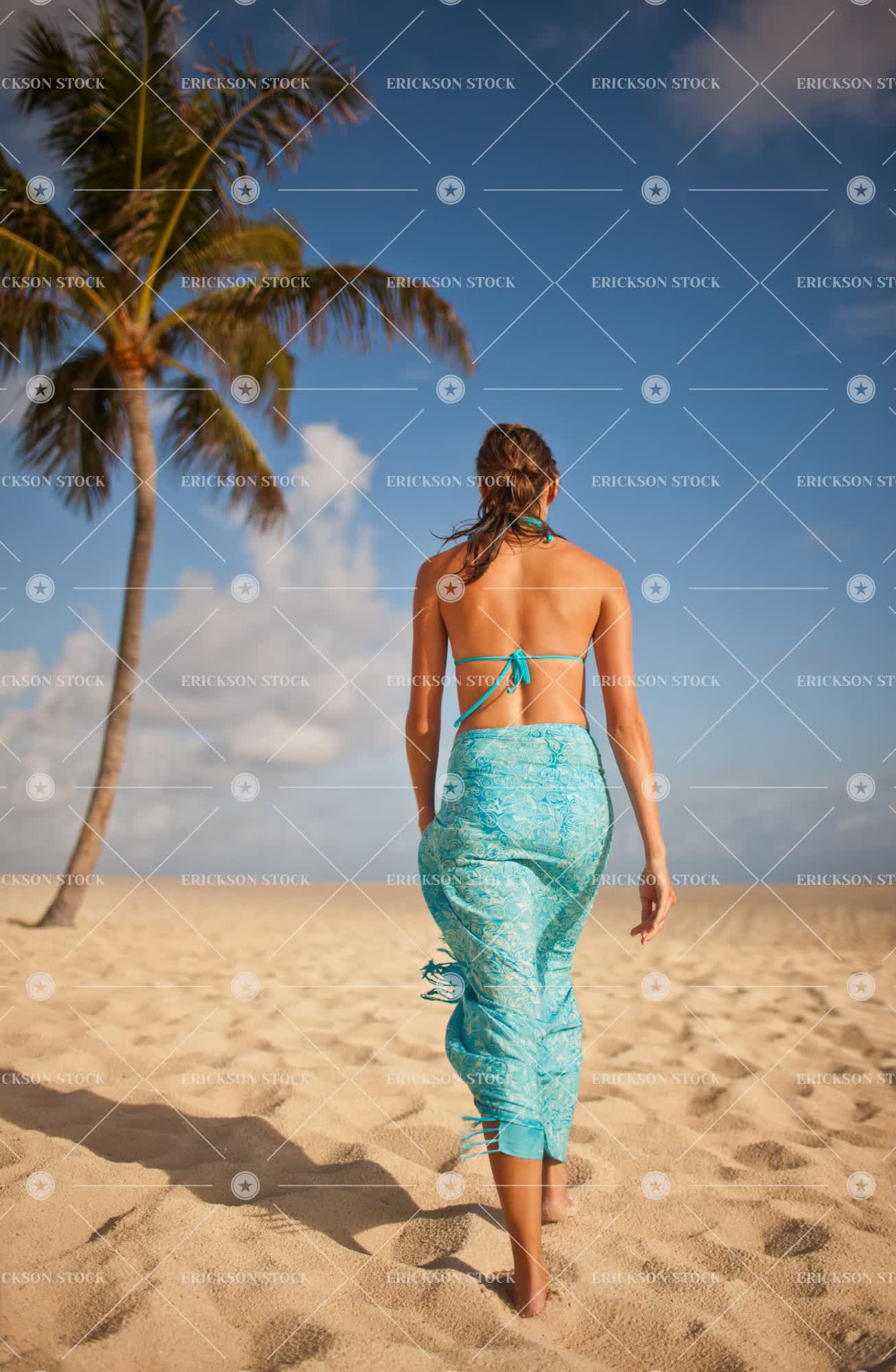 Young woman wearing a bikini and sarong while walking on a sandy beach.