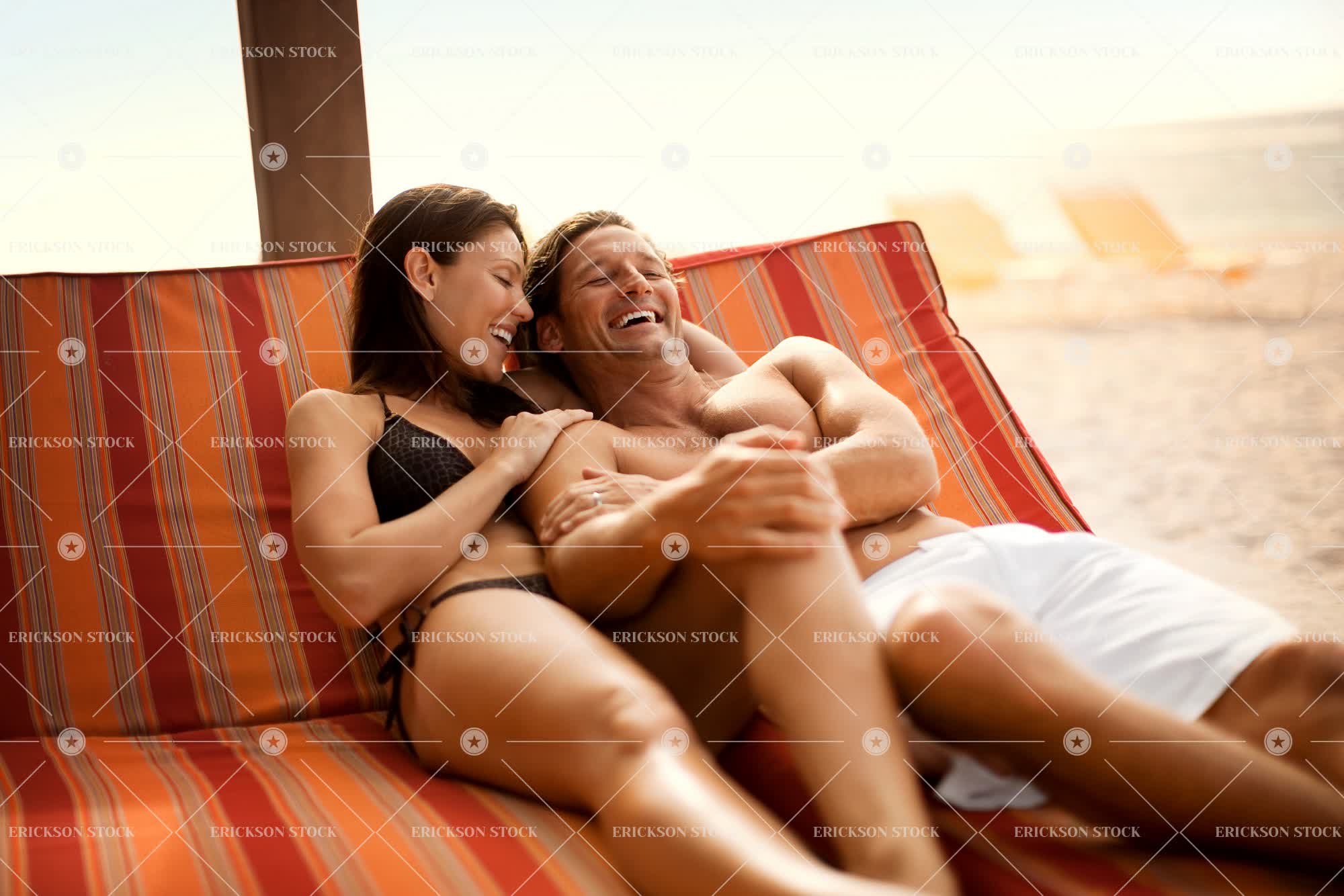 Happy mid-adult couple laughing while lying side by side on a deck chair at a beach resort.