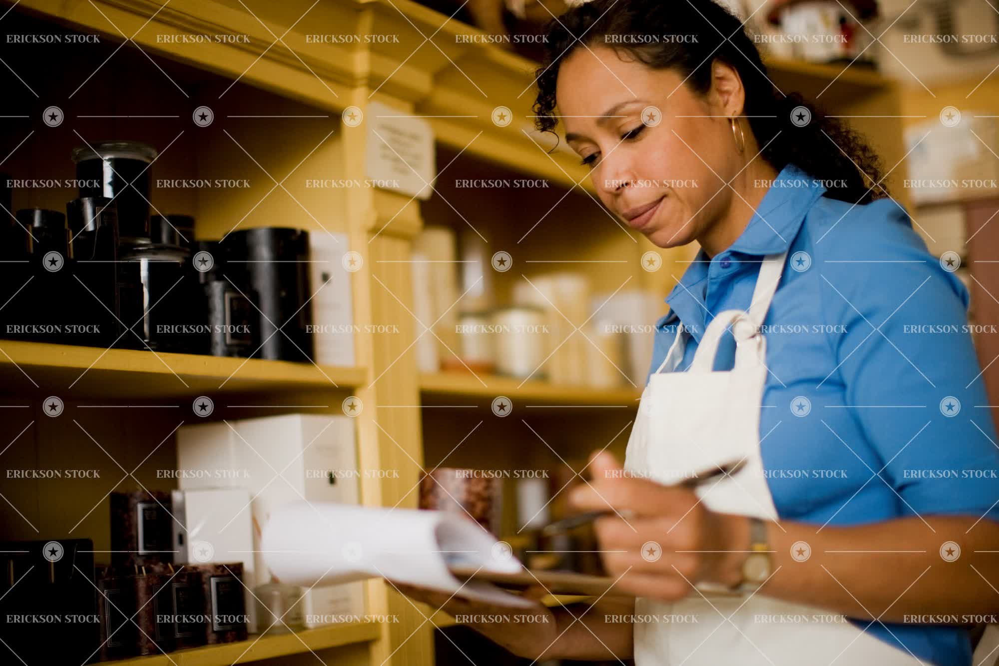 Tags adult, african american, apron, candle, clipboard, concentrate, female, head, head & shoulders, head and shoulders, head shot, headshot, horizontal, indoor, indoors, inside, inventories, inventory, mature adult, mid adult, one person, paper, papers, pen, pens, person, retail, sales clerk, sales clerks, selective focus, sheet of paper, sheets of paper, shelf, shelves, shop, shops, shoulders, store, stores, woman, write, writes, writing, young adult