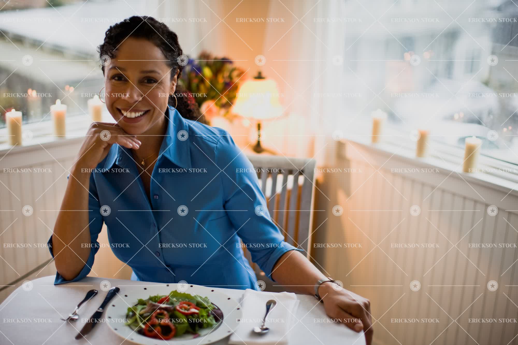 Tags adult, african american, brunette, burn, button down shirt, candle, candlelight, cheerful, collared shirt, copy space, curl, day, delight, dining room, dinner, enjoyment, Eye contact, female, Food, glowing, grinning, half length, happiness, happy, home, home interior, home interiors, homes, horizontal, house, house interior, house interiors, houses, indoor, indoors, inside, interior, interiors, joy, joyful, leisure, leisure activities, leisure activity, look at camera, looking at camera, mature adult, meal, mid adult, negative space, negative space right, one person, person, recreation, recreational pursuit, recreational pursuits, selective focus, shirt, shirts, sit, sitting, smile, smiling, table, Tables, toothy smile, waist up, woman