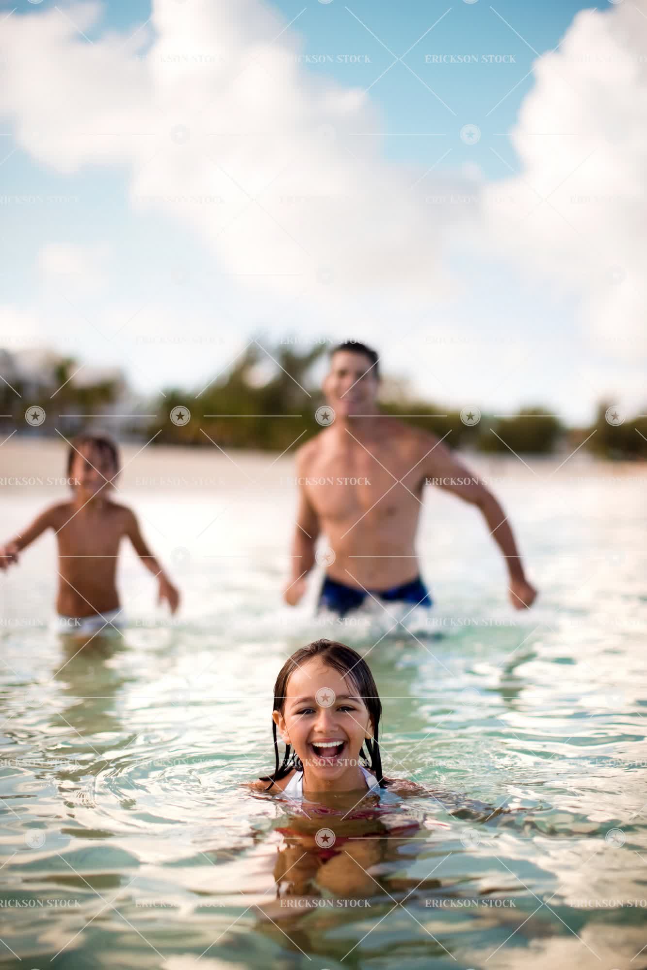 Portrait of a smiling young girl swimming with her family at the beach.