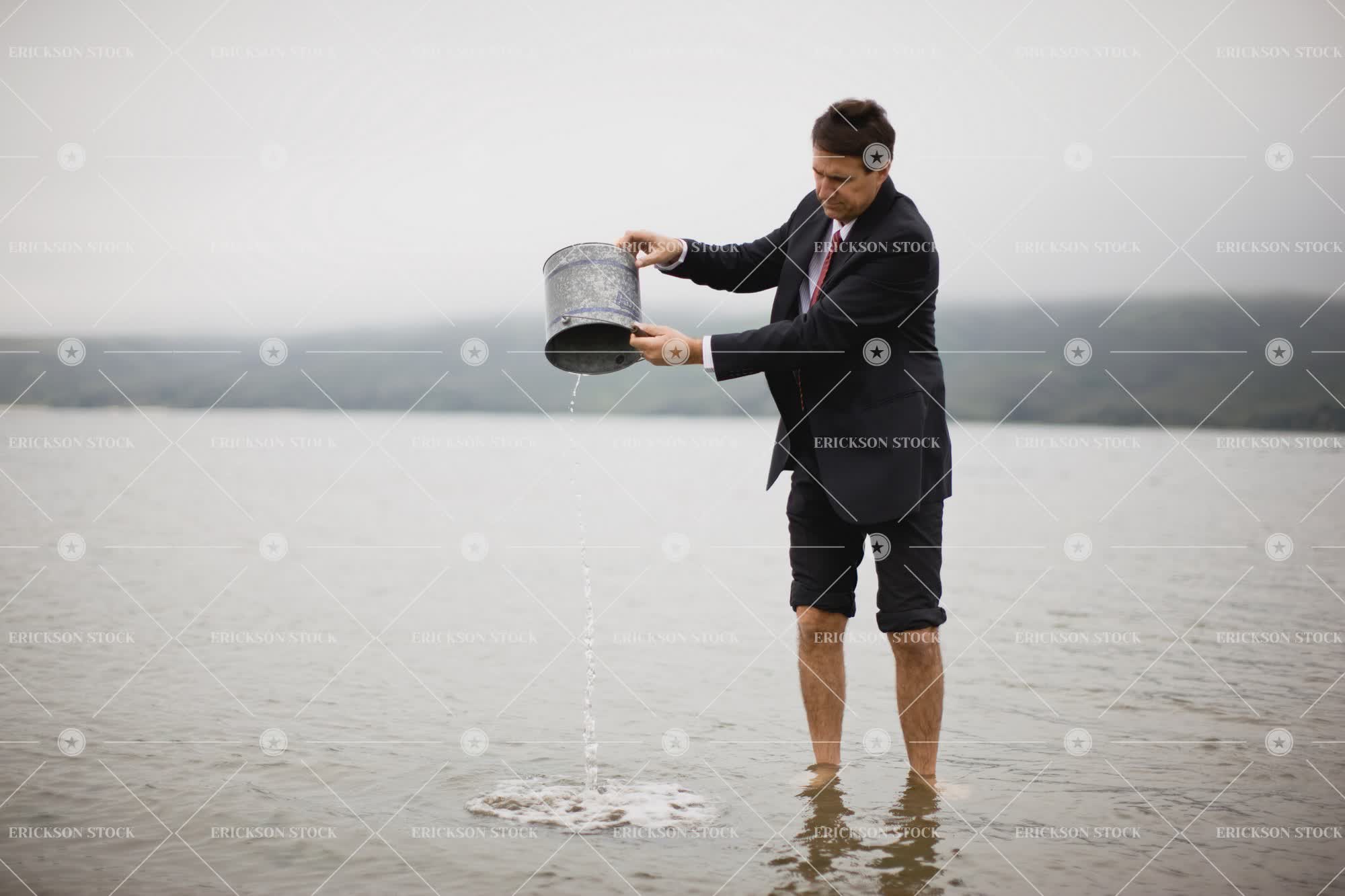 Businessman pouring water out of bucket