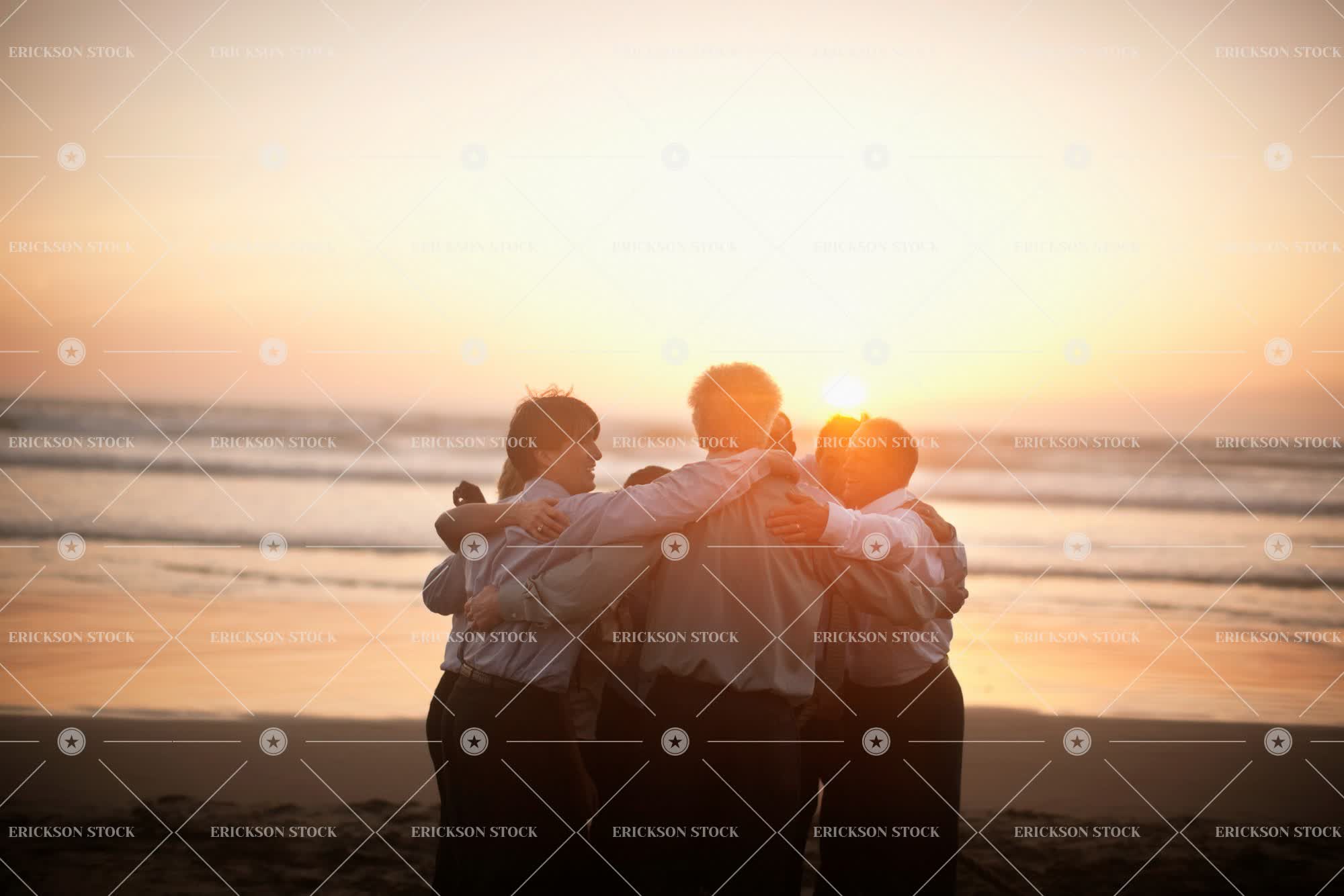 Small group of businessmen stand in a circle and embrace each other while standing on a beach at sunset.