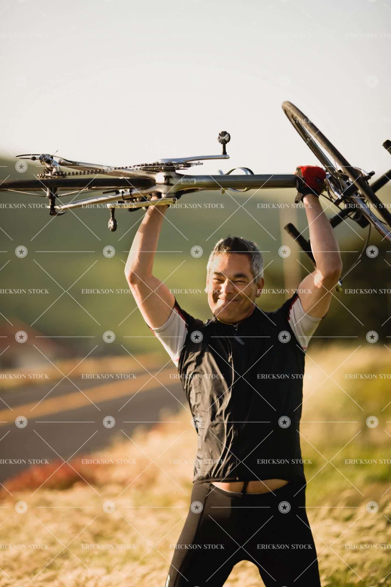 Tags achievement, adult, bicycle shorts, bike, carry, caucasian, closed eyes, day, energetic, energy, enthusiasm, enthusiastic, eyes closed, gray hair, grey hair, grimace, grimacing, hold, holding, leisure, leisure activities, leisure activity, male, man, mature adult, mid adult, one person, outdoor, outdoors, outside, person, recreation, recreational pursuit, recreational pursuits, ride, road, roads, selective focus, Shorts, sport, Sports, sports clothes, sports clothing, sportswear, street, streets, success, successful, three quarter length, transport, Transportation, vertical, victories, victorious, victory, vigor, vital, vitality, winner, winners