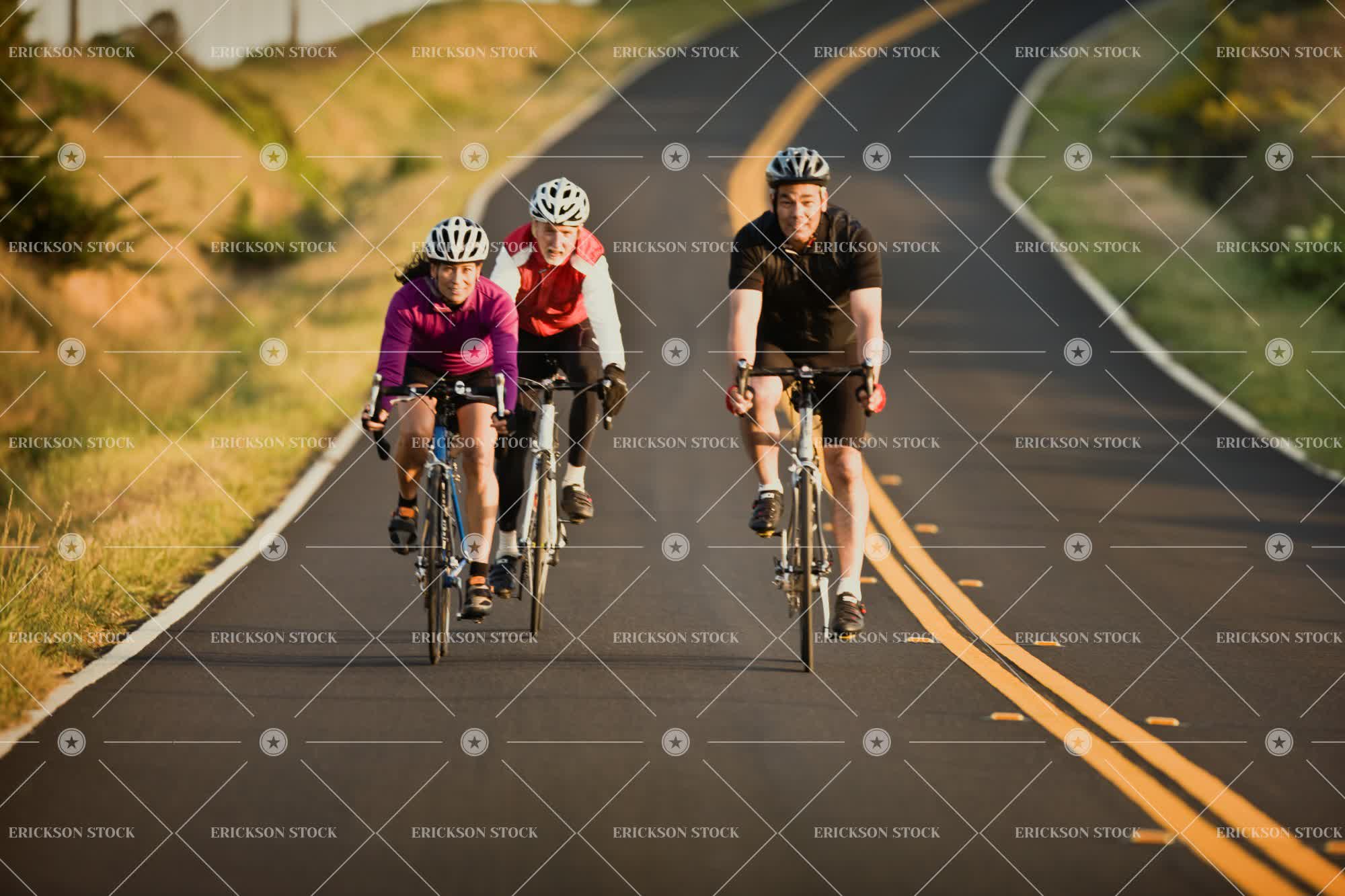 Three mature cyclists on the road
