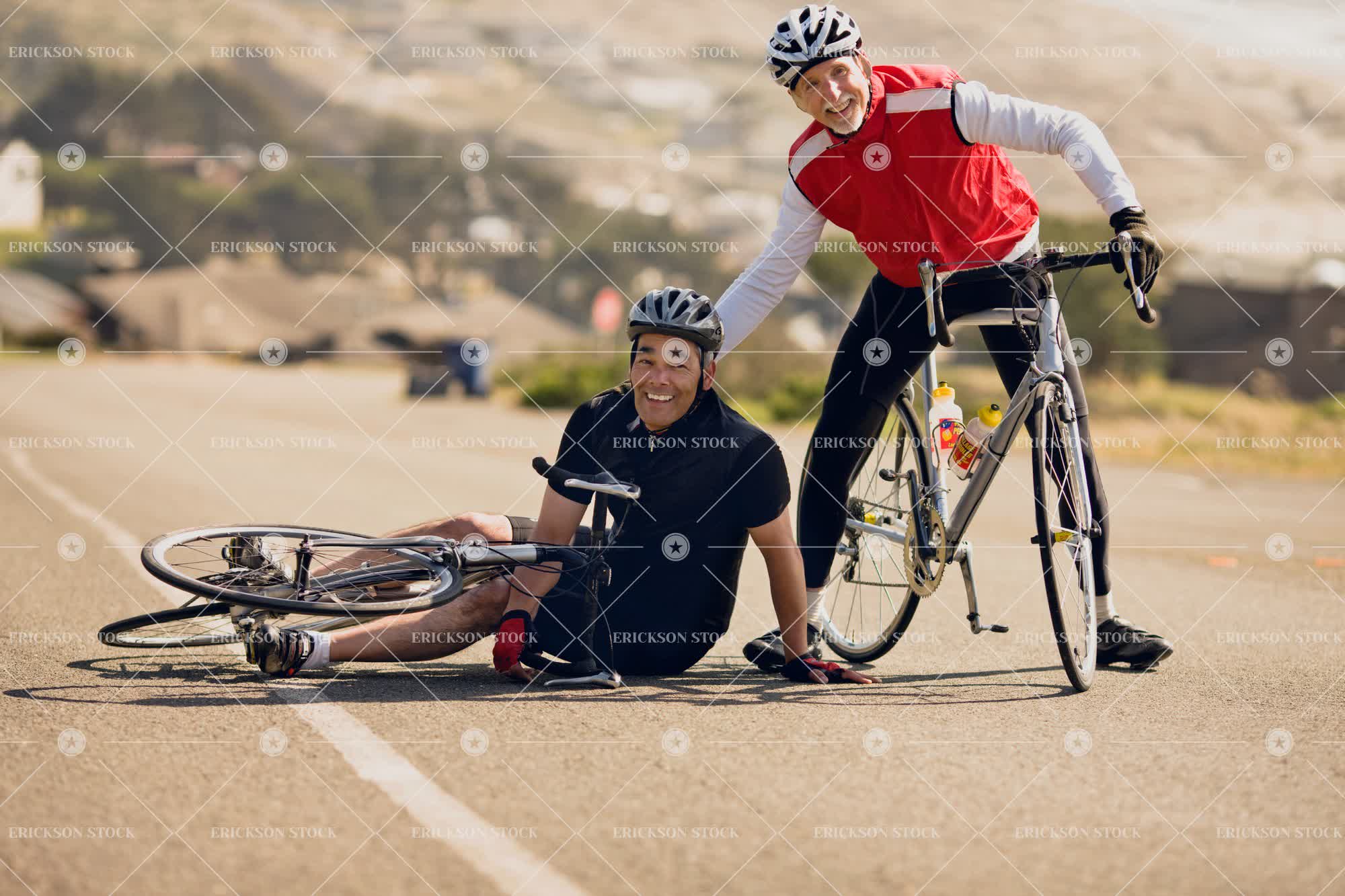Tags accident, adult, awkward, bicycle helmet, bicycle shorts, bike, caucasian, cheerful, clumsy, day, elderly, embarrassed, embarrassment, enjoyment, fallen, falling, falling over, fool, foolish, fools, full length, grinning, happiness, happy, helmet, helmets, horizontal, leisure, leisure activities, leisure activity, male, man, mature adult, mid adult, misfortune, old, outdoor, outdoors, outside, person, recreation, recreational pursuit, recreational pursuits, ride, rides, riding, road, roads, safety helmet, safety helmets, selective focus, senior adult, sheepish, Shorts, smile, smiling, sport, Sports, sports clothes, sports clothing, sportswear, street, streets, toothy smile, transport, Transportation, two people