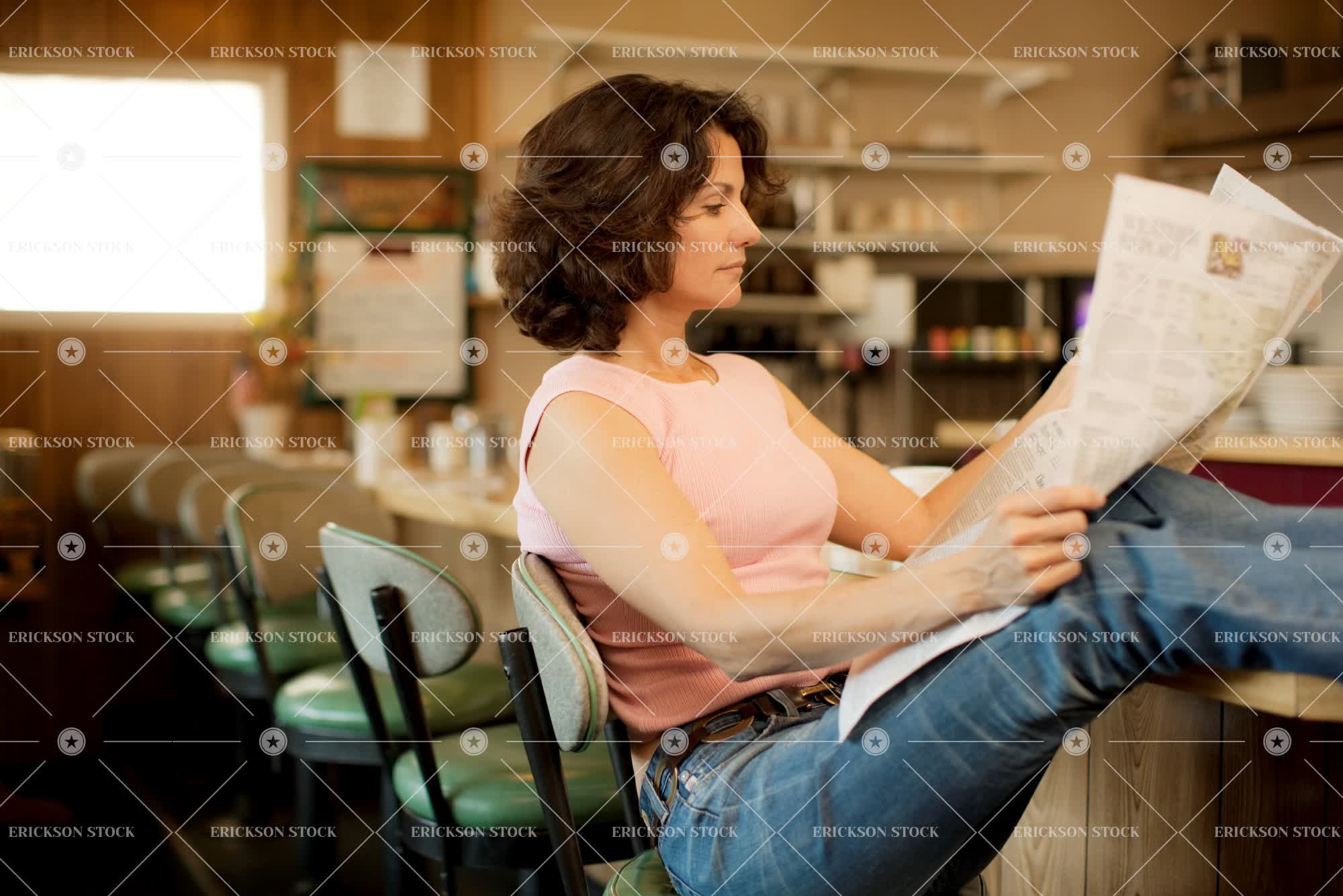 Tags adult, cafe, caucasian, coffee shop, comfort, diner, eat, feet up, female, Food, foot up, horizontal, indoor, indoors, inside, leisure, leisure activities, leisure activity, mature adult, mid adult, news, newspaper, newspapers, one person, paper, people, person, read, reading, recreation, recreational pursuit, recreational pursuits, Relaxation, relaxed, relaxing, selective focus, three quarter length, woman
