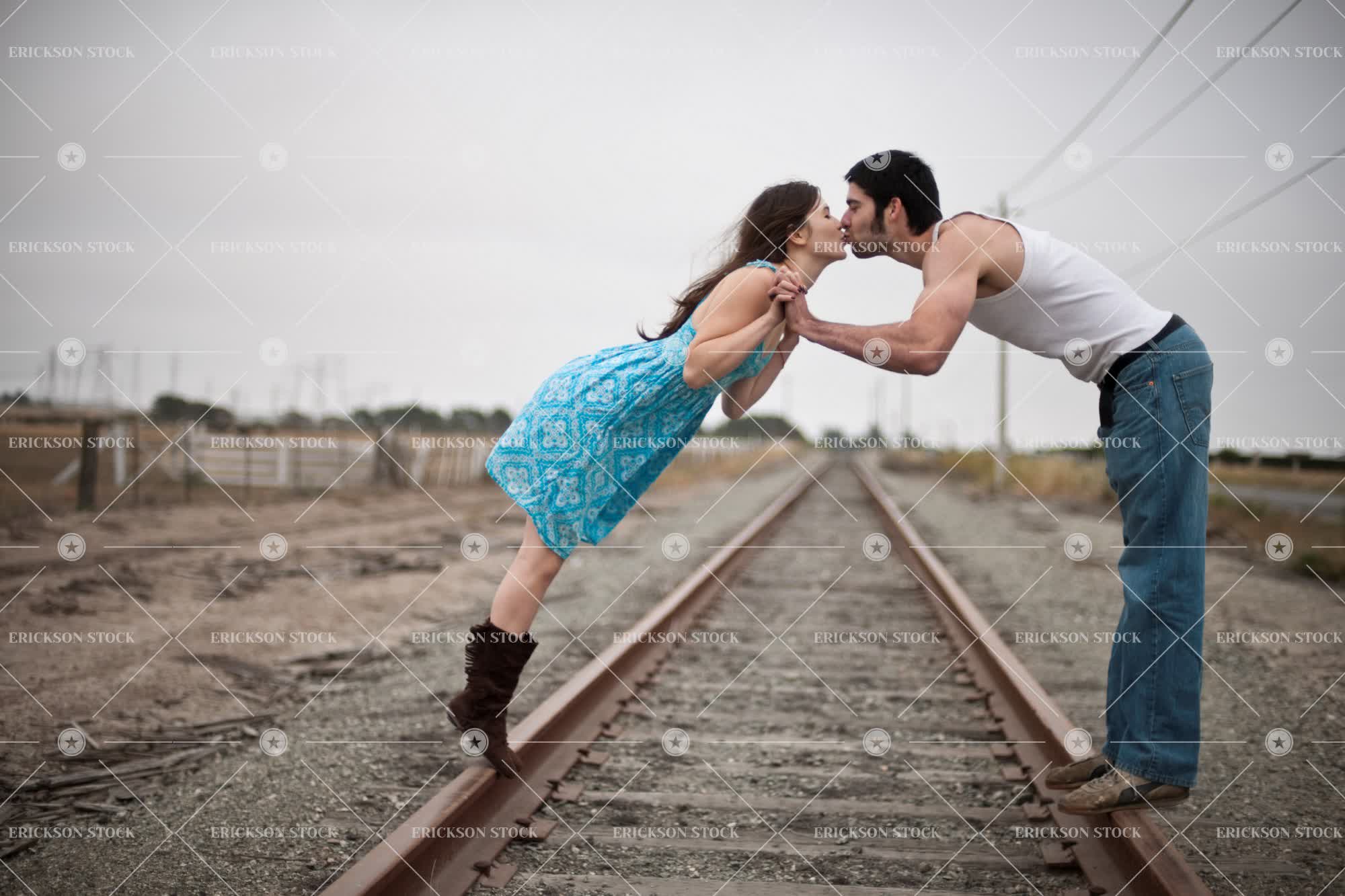 Young couple kissing while standing on train tracks