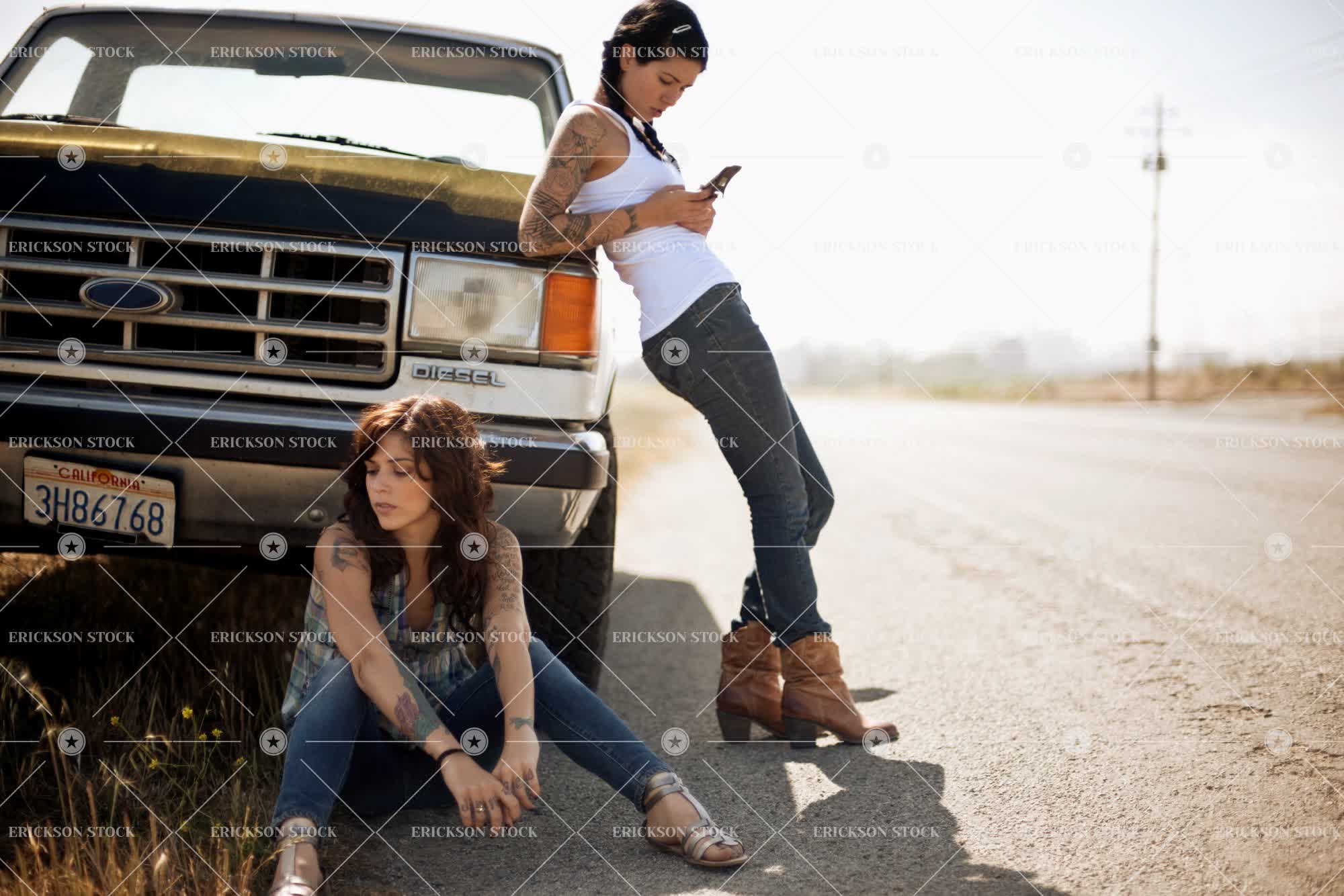 Two female friends leaning against their broken down pick-up truck.