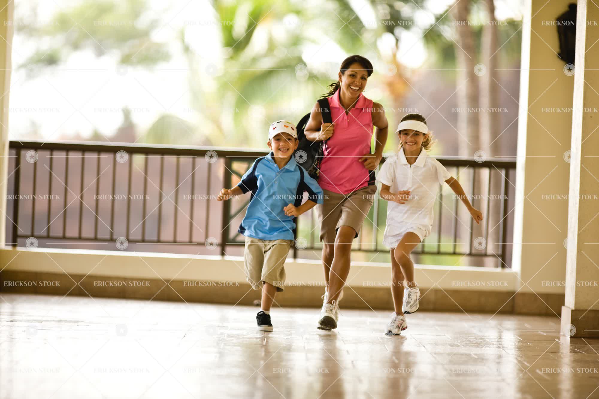 Mother and two children running along verandah.