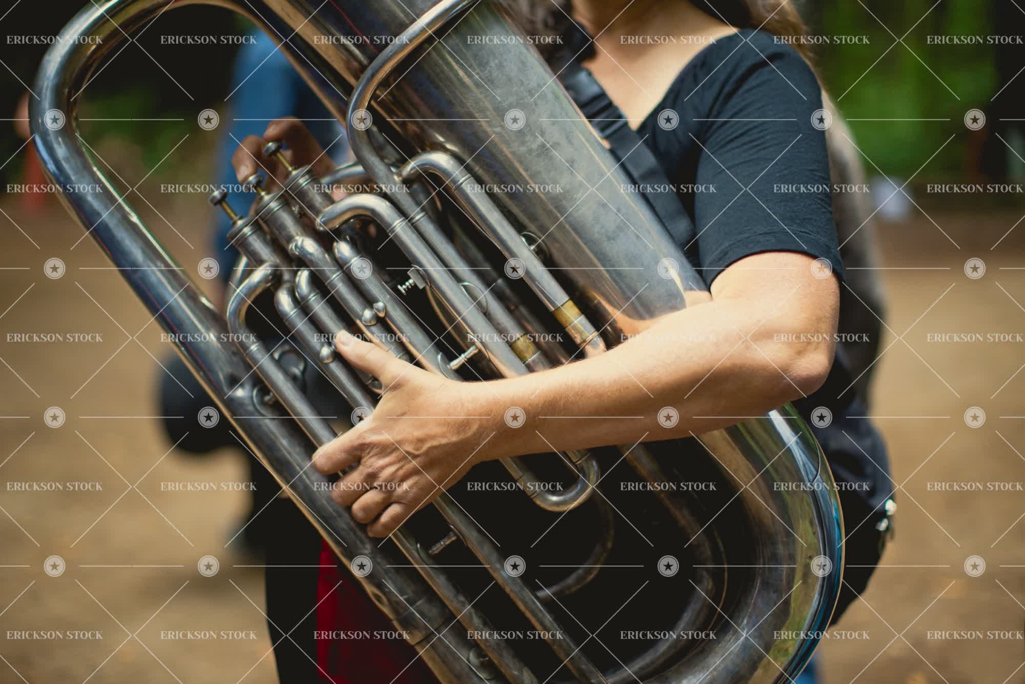Tags adult, big, brass instrument, caucasian, close up, cropped, cumbersome, day, female, heavy, horizontal, instrument, instruments, large, leisure, leisure activities, leisure activity, midsection, Music, Musical instrument, musical instruments, Musician, musicians, one person, outdoor, outdoors, outside, part of, people, person, play, Playing, playing instrument, playing instruments, playing musical instrument, playing musical instruments, Practice, practicing, practise, practising, recreation, recreational pursuit, recreational pursuits, selective focus, tuba, tubas, wind instrument, wind instruments, woman