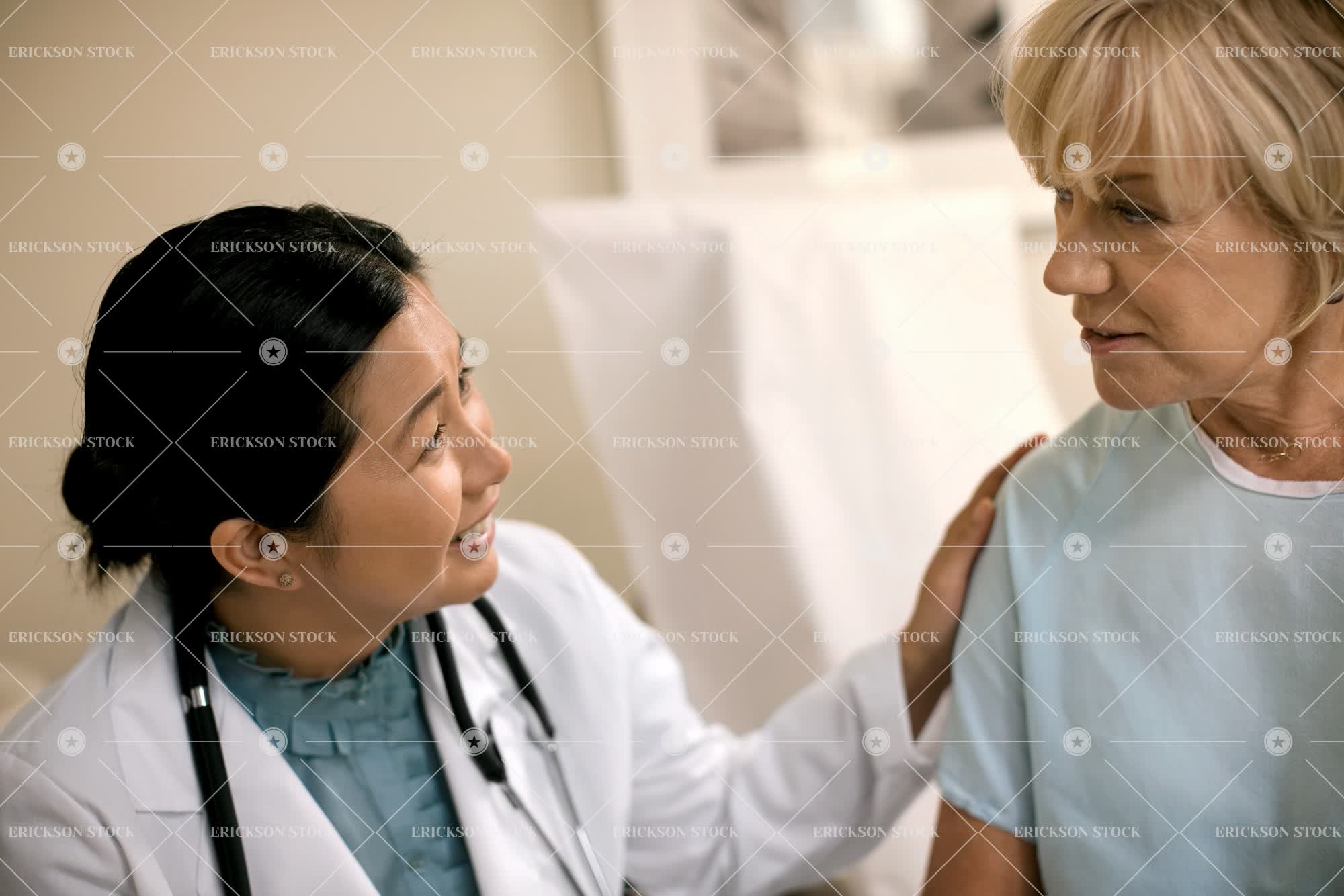 Tags achievement, adult, asian, authority, black hair, brunette, caucasian, cheerful, comfort, delight, doctor, doctor's office, enjoyment, exam, examination, exams, expert, expertise, experts, expressing positivity, face to face, facing each other, female, good news, hand on shoulder, hands on shoulders, happiness, happy, health, healthcare, hospital, hospital gown, hospital gowns, hospitals, ill, illness, indoor, indoors, inside, job, jobs, joy, joyful, lab coat, lab coats, looking at each other, mature adult, md, medical, medical exam, medical practitioner, medical practitioners, medicine, mid adult, occupation, occupations, patient, patients, people, person, physician, physicians, place of work, problems, selective focus, senior adult, sick, sickness, smile, smiling, specialist, specialists, stethoscope, stethoscopes, success, successful, two people, woman, work, working, young adult