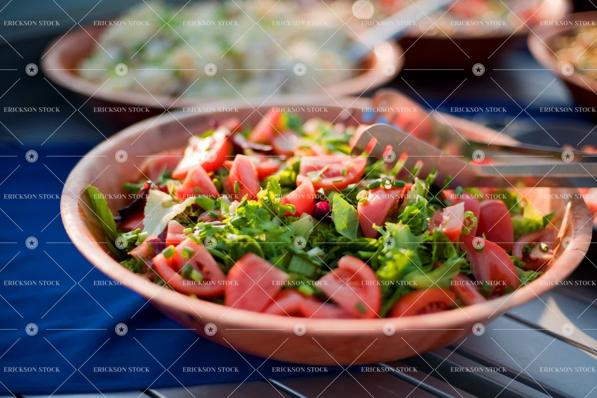 Tags bowl, day, Food, Food and drink, fresh, freshness, healthy, healthy eating, healthy food, horizontal, lettuce, lettuces, meal, meals, nobody, outdoor, outdoors, outside, plate, plates, salad, salads, selective focus, tomato, tomatoes, tongs, vegetable, vegetables