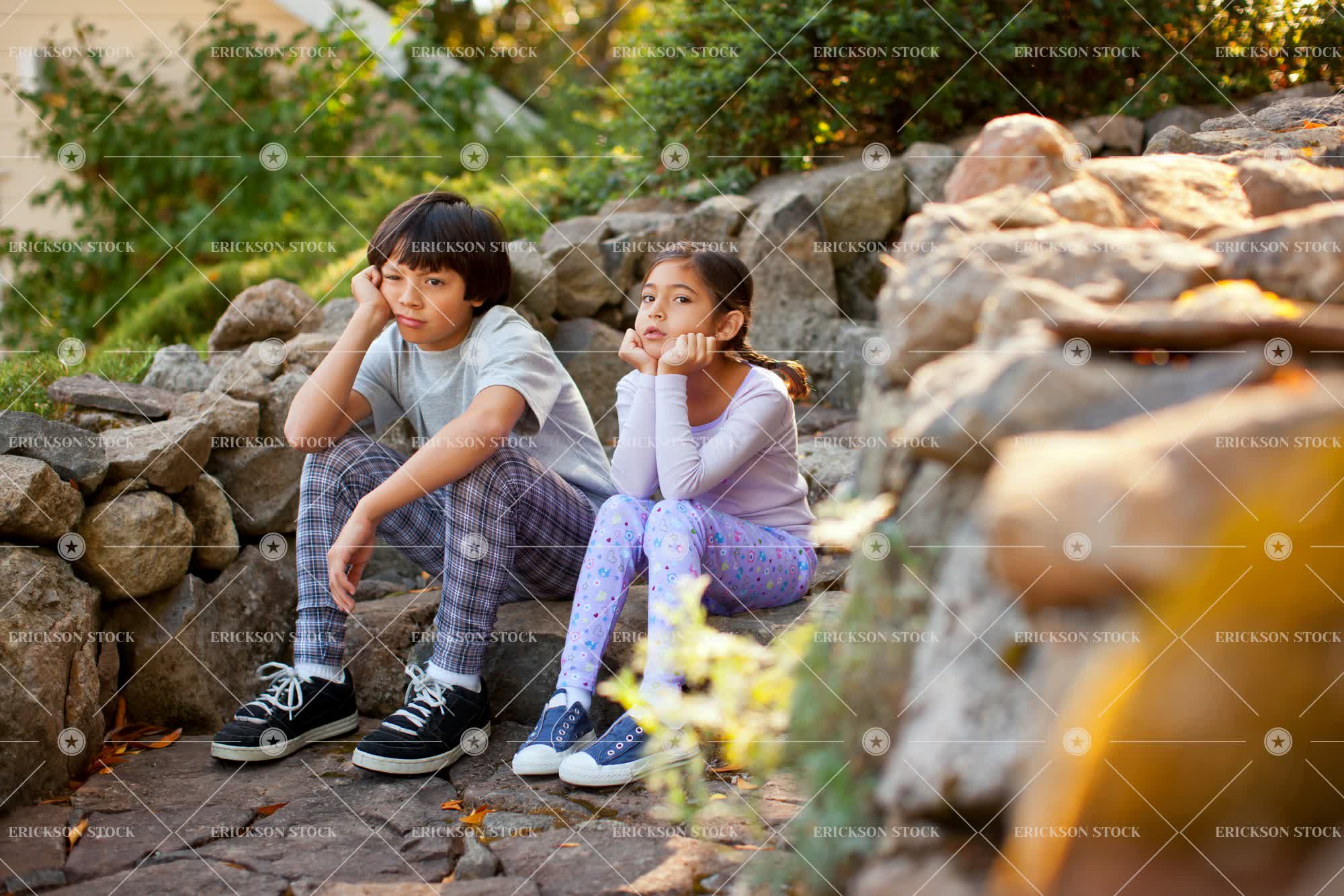 Unhappy brother and sister sitting next to each other on a stone step.