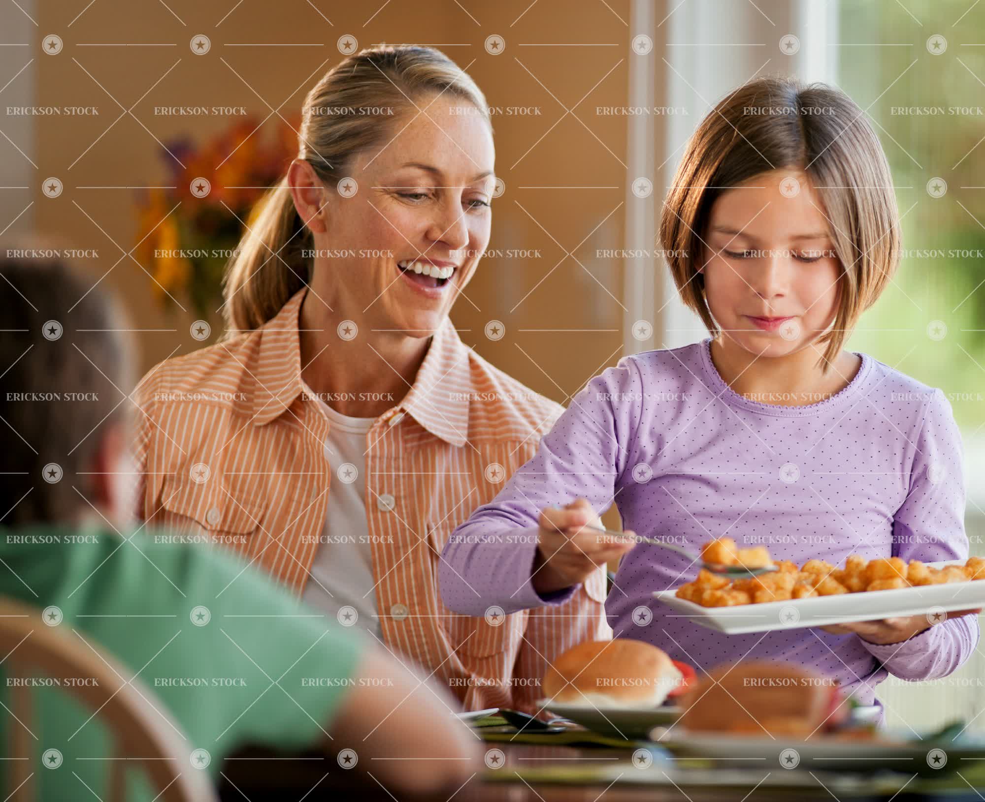 Tags adult, blond, bond, casual clothes, caucasian, cheerful, child, delight, dining room, dining table, dish, elementary age, enjoyment, family, female, Food, Food and drink, Fun, girl, girls, half length, happiness, happy, having fun, hold, holding, holds, home, home interior, home interiors, homes, horizontal, house, house interior, house interiors, houses, indoor, indoors, inside, interior, interiors, joy, joyful, kid, kids, leisure, leisure activities, leisure activity, mature adult, meal, meals, mid adult, mom, mother, mum, parent, parents, people, person, place setting, place settings, recreation, recreational pursuit, recreational pursuits, selective focus, serve, serving, sit, sitting, smile, smiling, table, Tables, together, togetherness, waist up, woman, young adult