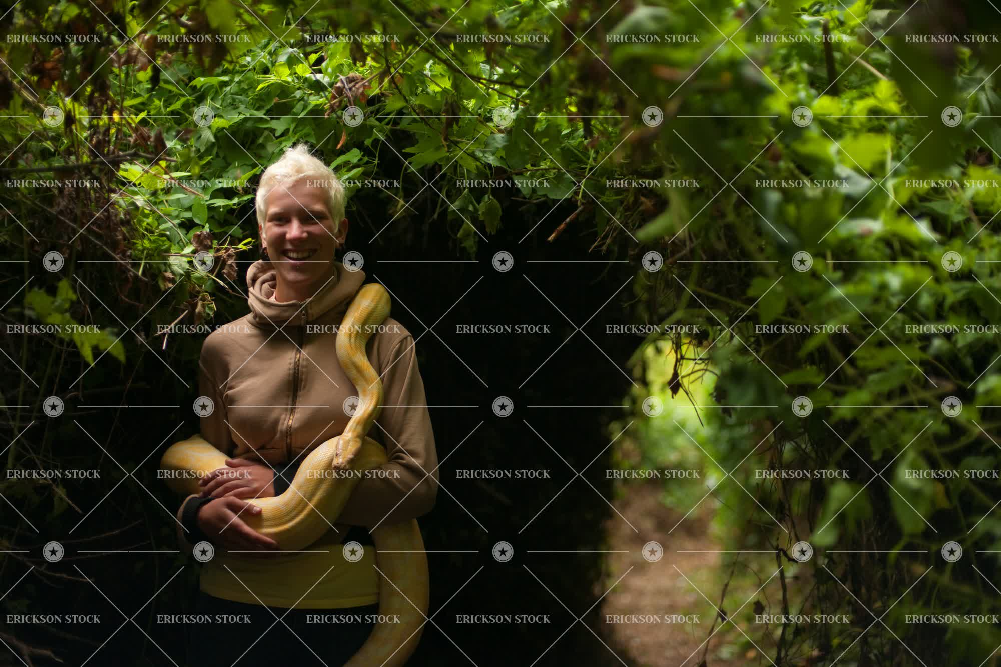 Tags adult, animal, blond, caucasian, cheerful, copy space, day, delight, enjoyment, Eye contact, female, foliage, forest, forests, gray hair, green, Growth, half length, happiness, happy, horizontal, individuality, joy, joyful, look at camera, looking at camera, lush, lush foliage, natural, nature, negative space, one animal, one person, out of context, outdoor, outdoors, outside, people, person, pierced, piercing, piercings, reptile, reptiles, selective focus, smile, smiling, snake, snakes, teenager, towhead, Tree, trees, unusual, waist up, woman, wood, woods, young adult