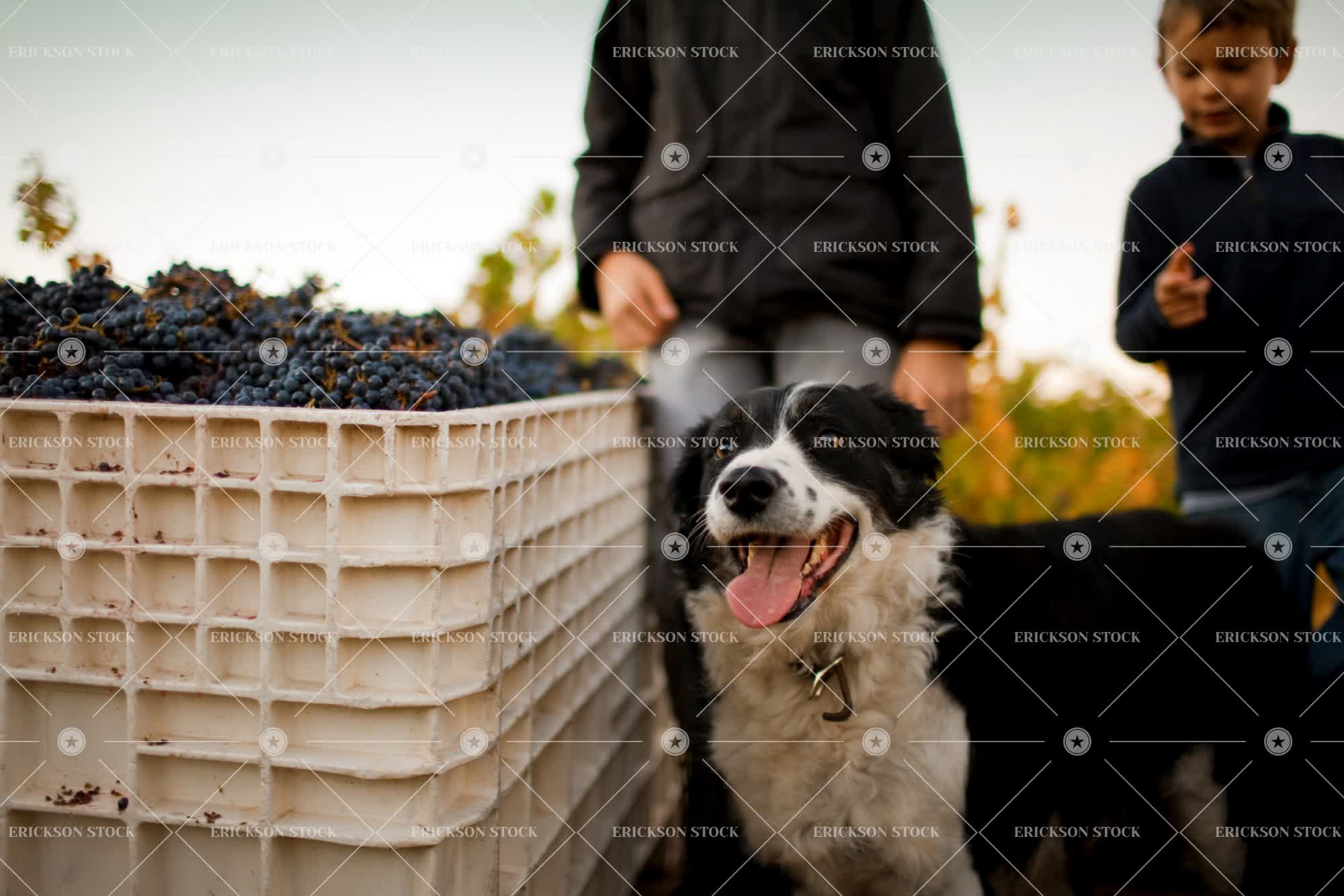 Tags agriculture, alert, animal, boy, caucasian, child, container, country, countryside, crop, cropped, curious, day, dog, domestic, elementary age, farm, farming, farmland, farms, field, fields, Food, food and drink industry, food industry, fruit, grape, grape vine, grape vines, grapes, harvest, harvested, harvesting, harvests, heap, heaps, horizontal, inquiring, inquisitive, kid, kids, low section, male, midsection, mouth open, one animal, open mouth, outdoor, outdoors, outside, part of, pet, pets, picking, pile, piles, rural, rural scene, selective focus, three quarter length, two people, vine, vines, vineyard, vineyards, viniculture, viticulture, wine industry, winemaking