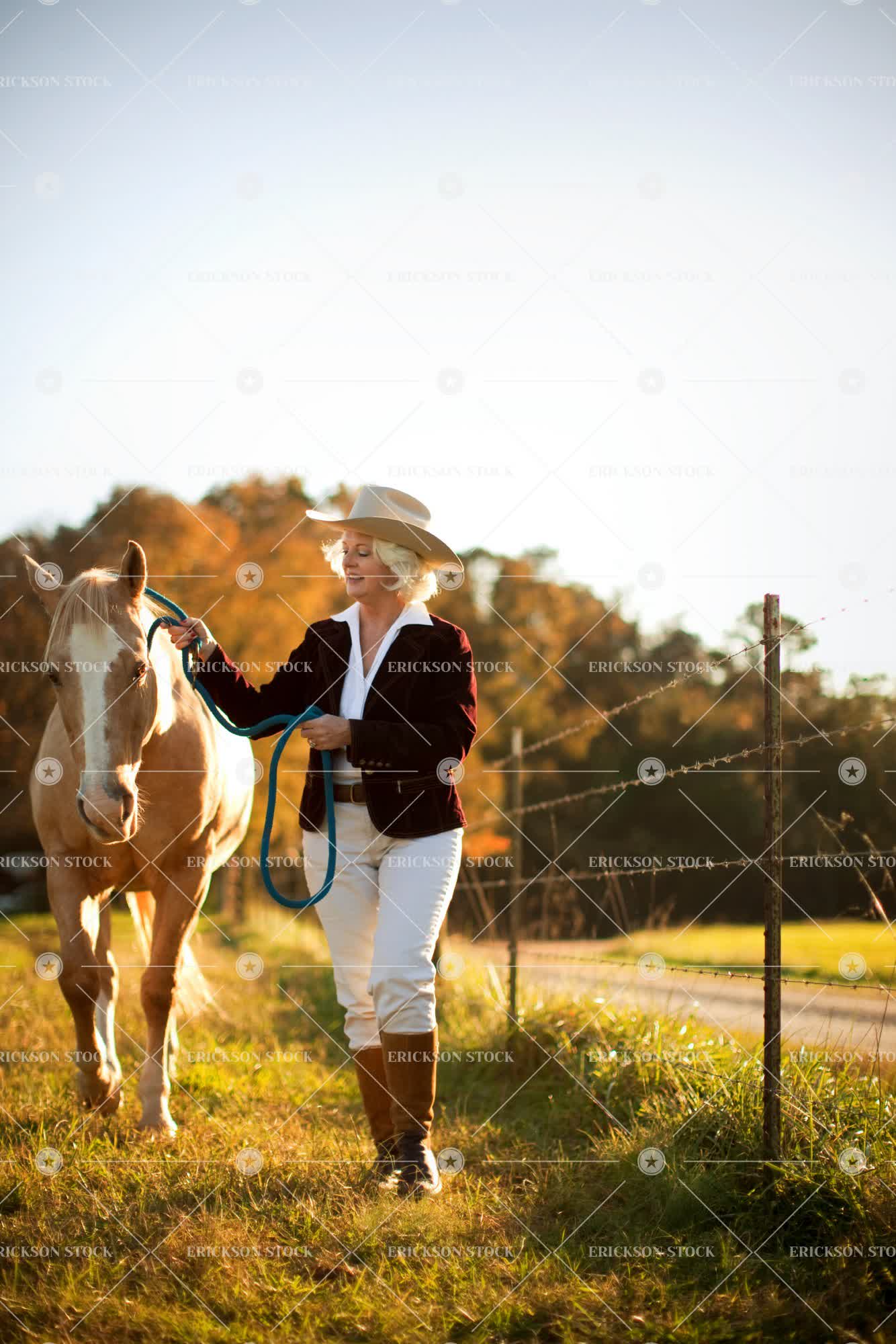 Tags adult, alert, animal, caucasian, copy space, country, countryside, cowboy hat, day, equine, equines, female, Fence, fenced, fences, full length, grass, grassy, hat, hats, herbivore, herbivores, herbivorous, hoof, hoofed, hoofed animal, hoofed animals, horse, horses, Mammal, mammals, mature adult, mid adult, negative space, one animal, one person, outdoor, outdoors, outside, people, person, pet, pets, rural, selective focus, vertical, walk, Walking, walks, woman