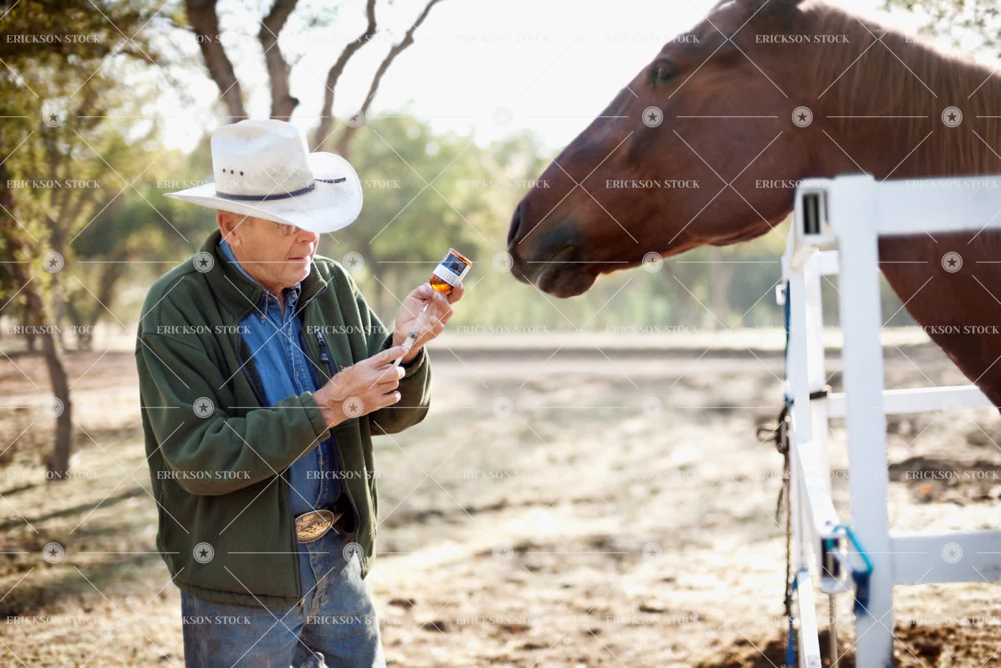 Mature man wearing a cowboy hat carefully fills a hypodermic needle with medicine to inject into a horse waiting in a corral.