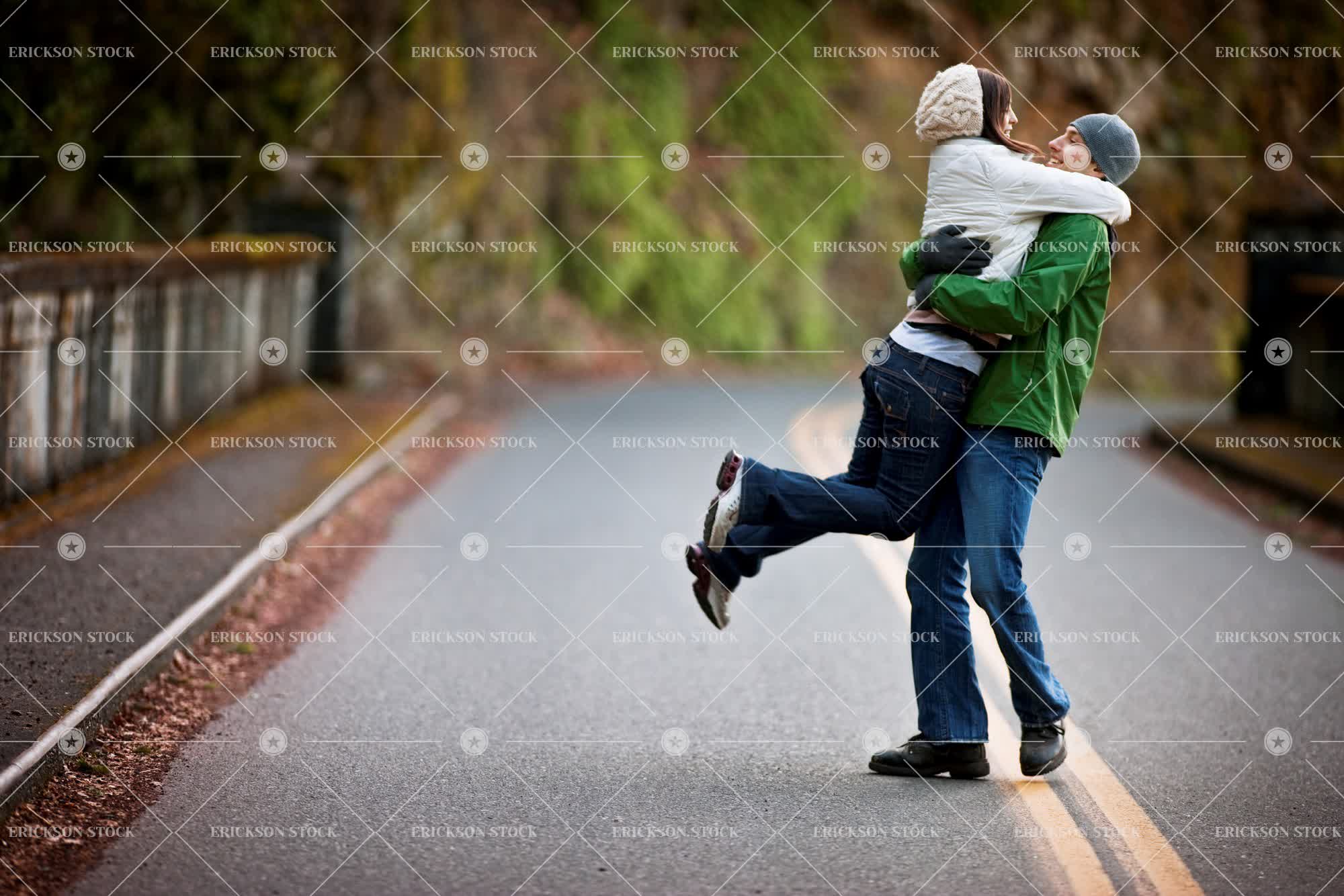 Tags adult, affectionate, arm around, beanie, caucasian, cheerful, copy space, copy space left, couple, day, delight, embrace, embracing, enjoyment, face to face, facing each other, female, full length, Fun, happiness, happy, hat, hats, having fun, heterosexual, heterosexual couple, heterosexual couples, holding, horizontal, hug, hugging, joy, joyful, knit hat, knit hats, knitted hat, knitted hats, leisure, leisure activities, leisure activity, lift, Lifting, lifts, looking at each other, love, loving, male, man, mid adult, negative space, negative space left, outdoor, outdoors, outside, partner, people, person, play, Playful, Playing, plays, recreation, recreational pursuit, recreational pursuits, relationship, relationships, road, roads, selective focus, Side view, smile, smiling, street, streets, together, togetherness, toque, toques, two people, warm clothes, warm clothing, woman, young adult