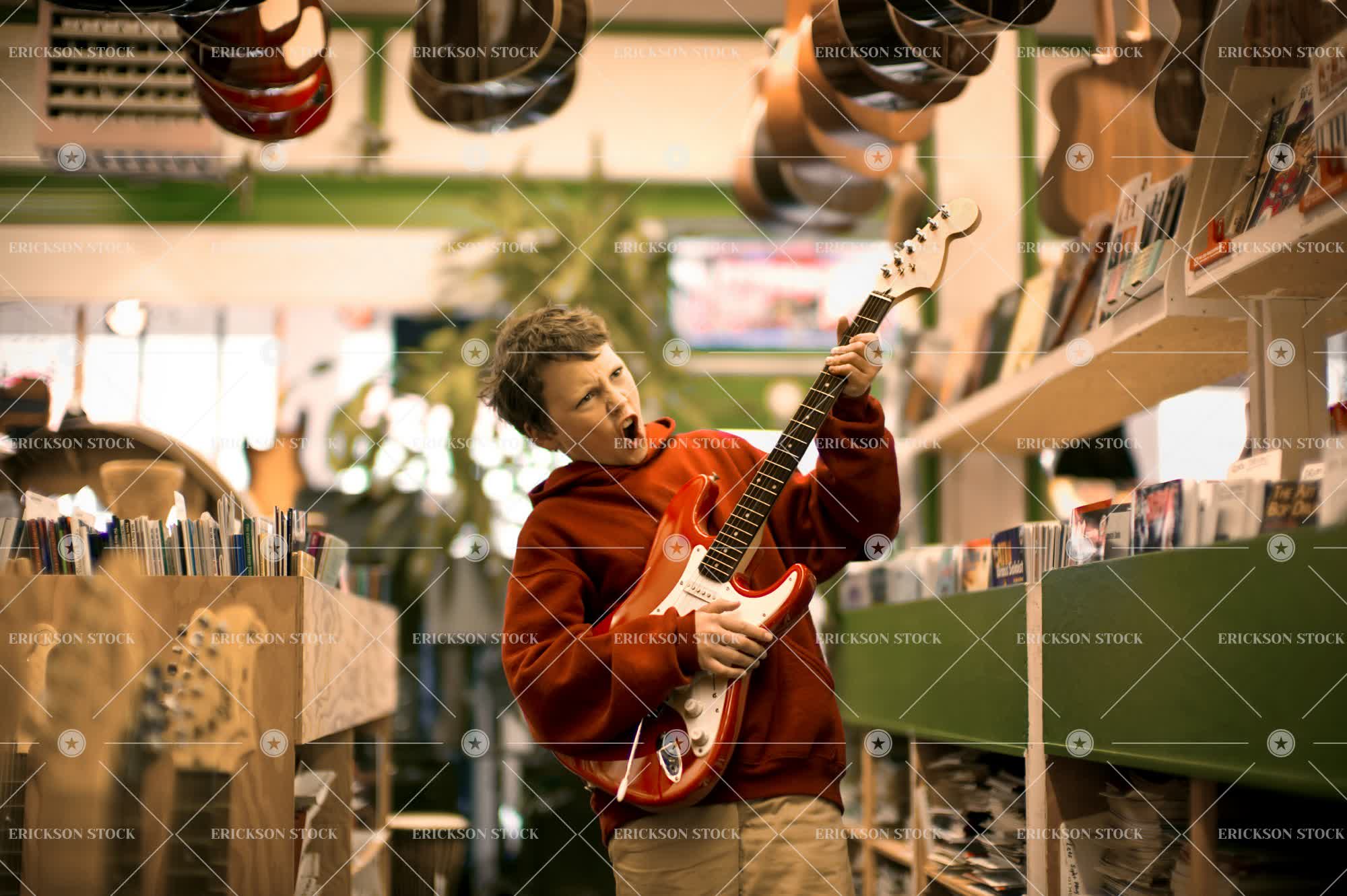 Tags boy, brunette, caucasian, child, electric guitar, electric guitars, elementary age, fantasizing, fantasy, funny face, grimace, grimacing, Guitar, guitar player, guitar players, Guitarist, guitarists, guitars, happiness, happy, hobbies, hobby, hood, hooded, hooded shirt, hooded shirts, hoodie, hoodies, horizontal, Imagination, imagining, indoor, indoors, inside, instrument, instruments, kid, kids, leisure, leisure activities, leisure activity, make believe, making a face, male, mouth open, Music, Musical instrument, musical instruments, Musician, musicians, one person, open mouth, people, person, play, Playful, Playing, playing guitar, playing instrument, playing instruments, playing musical instrument, playing musical instruments, Pretending, recreation, recreational pursuit, recreational pursuits, retail, selective focus, shelf, shelves, shop, shops, store, stores, sweatshirt, sweatshirts, three quarter length