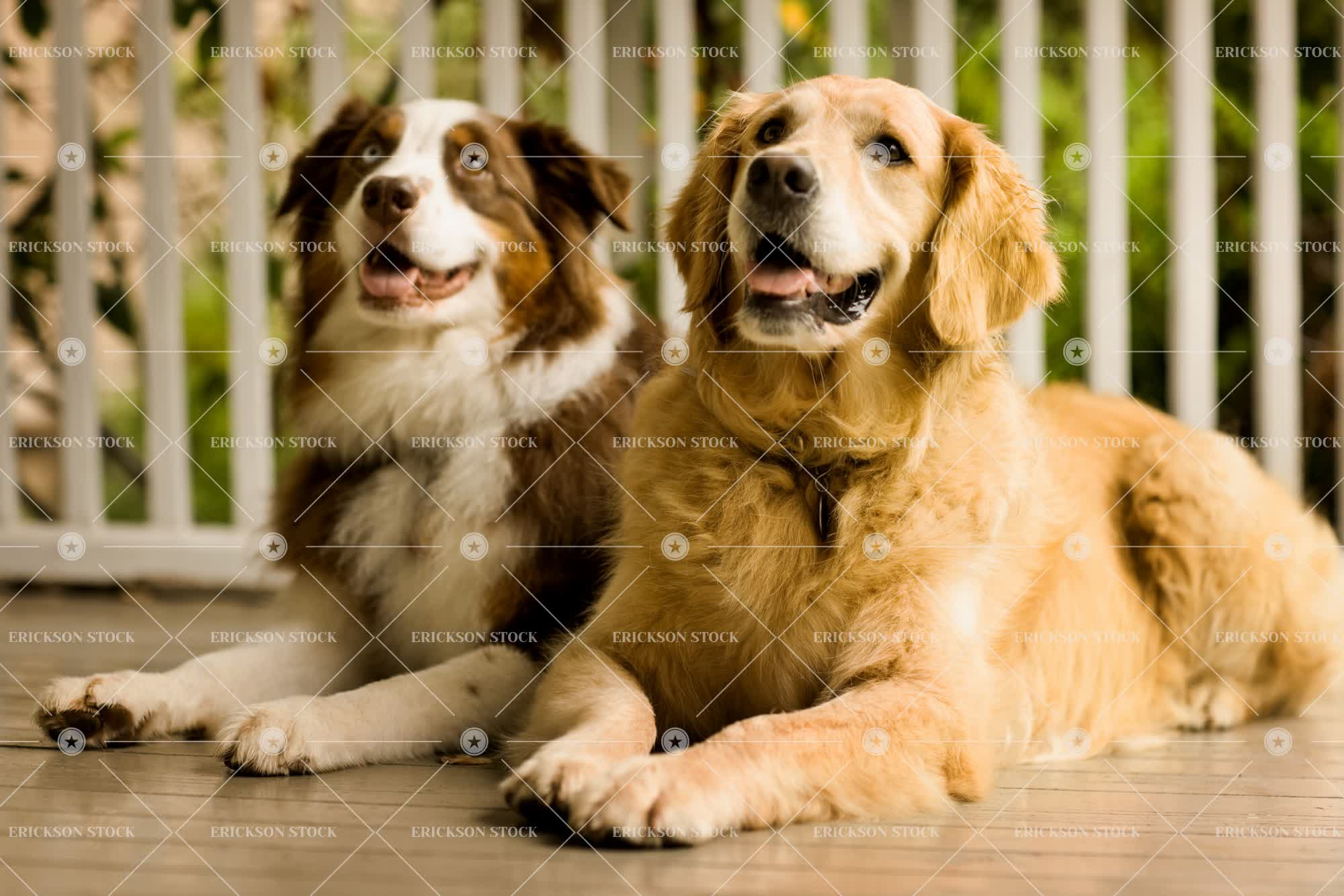 Portrait of two dogs resting together and looking hopeful.