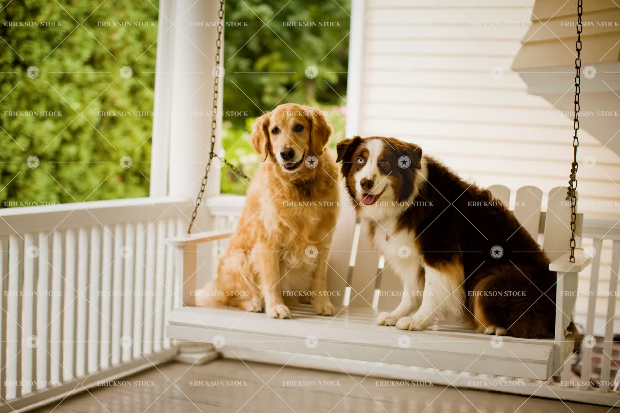 Tags adorable, alert, animal, chair, Cute, day, dog, domestic, Eye contact, horizontal, look at camera, looking at camera, nobody, outdoor, outdoors, outside, pet, pets, porch, seat, seats, selective focus, sit, sitting, together, togetherness