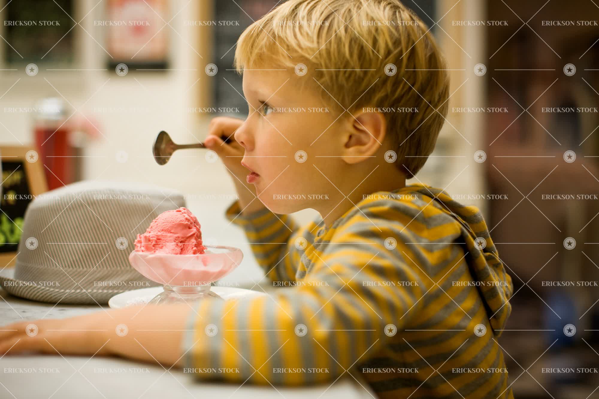 Young boy stares ahead and holds his spoon aloft as he eats a small glass bowl of pink ice cream while sitting at a restaurant counter.
