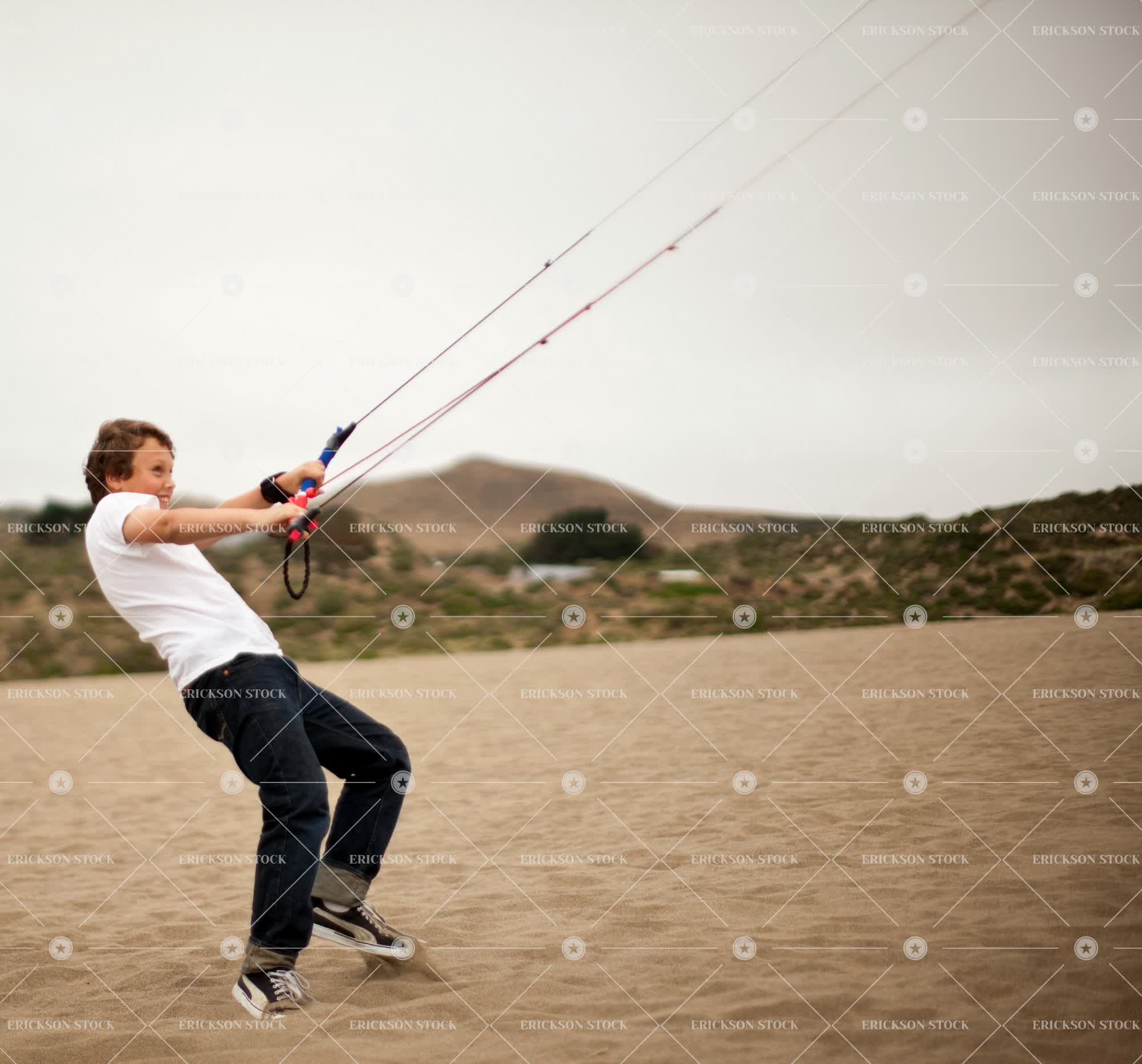 Boy looks up and pulls down hard on the handle of a two-string stunt kite as he stands on a sand dune.