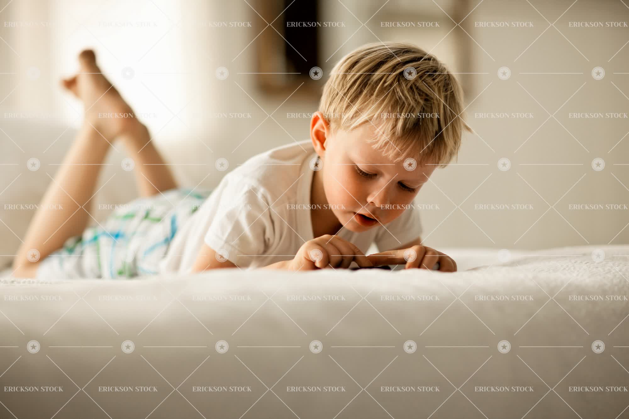 Tags affectionate, bed, bedroom, boy, care, caucasian, child, copy space, day, discover, domestic, elementary age, full length, happiness, happy, home interior, home interiors, horizontal, indoor, indoors, inside, kid, kids, learn, learning, leisure, leisure activities, leisure activity, lie down, look down, Looking, looking down, love, loving, Lying down, male, negative space, nurture, Nurturing, one person, people, person, Playful, Playing, preschool age, preschooler, preschoolers, recreation, recreational pursuit, recreational pursuits, selective focus, toddler, together, togetherness, watching