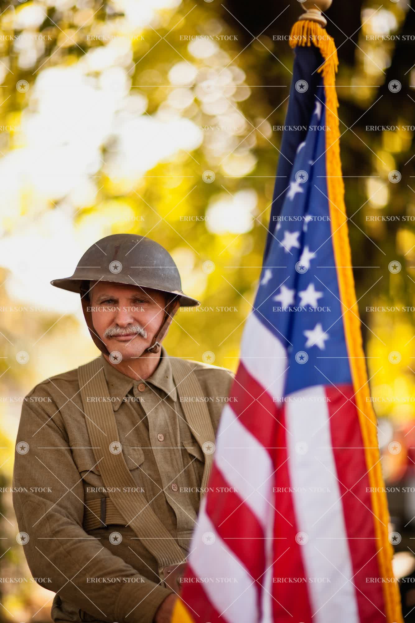 Mature male reenactor wearing an American World War steel combat helmet and uniform and holding up American flag poses for a portrait.