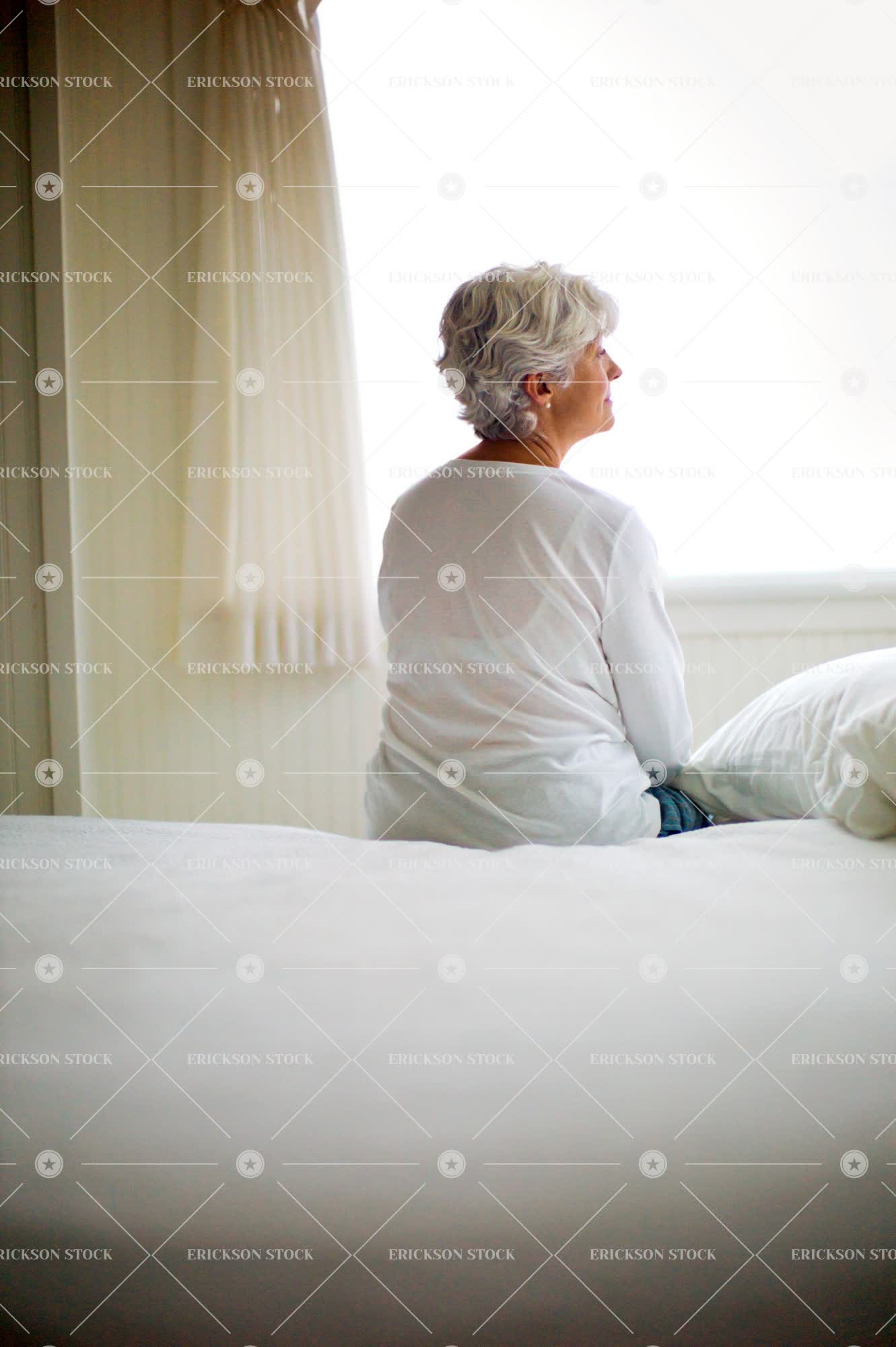 Tags adult, alone, back, back view, bed, bedroom, blinds, caucasian, comfort, contemplate, copy space, curtain, cushion, day, elderly, female, gray hair, grey hair, half length, home interior, home interiors, indoor, indoors, inside, Loneliness, lonely, look through window, looking through window, mature adult, negative space, old, one person, Pajamas, pensive, people, person, pillow, pillows, pyjama, pyjamas, rear, rear view, residential, residential district, residential districts, sad, sadness, selective focus, senior adult, sit, sitting, Sleepwear, solitude, Suburb, suburban, suburbia, suburbs, thinking, thought bubble, thought bubbles, thoughtful, top, vertical, waist up, white, window, windows, woman