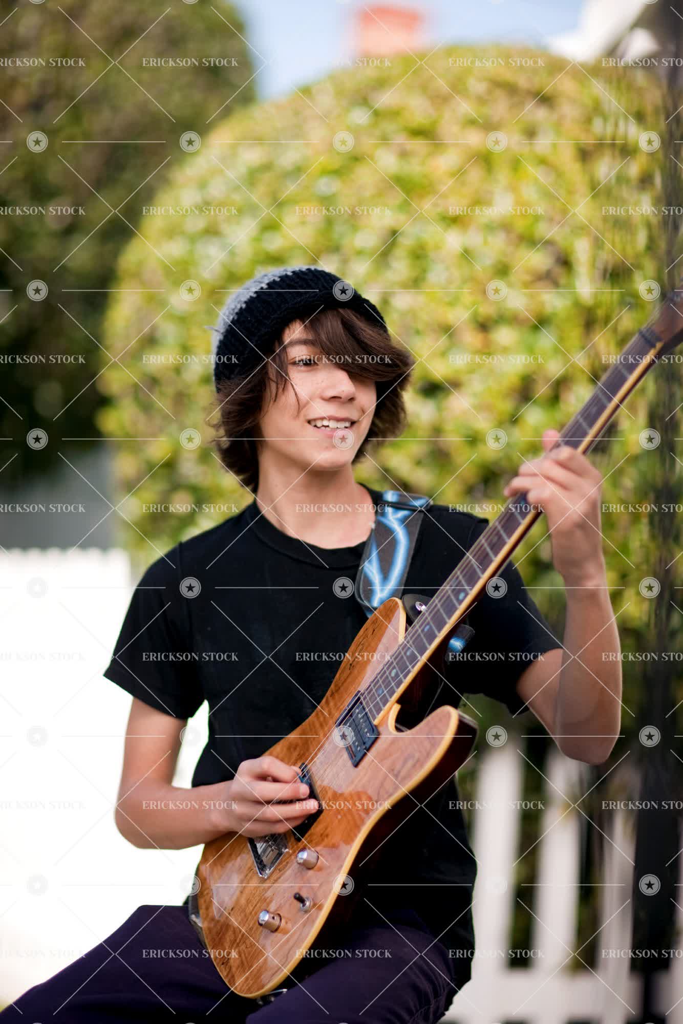 Tags boy, brunette, caucasian, cheerful, child, day, delight, enjoyment, Guitar, guitar player, guitar players, Guitarist, guitarists, guitars, happiness, happy, hat, hats, instrument, instruments, joy, joyful, kid, kids, leisure, male, Music, Musical instrument, musical instruments, Musician, musicians, one person, outdoor, outdoors, outside, people, person, play, Playing, playing guitar, playing instrument, playing instruments, playing musical instrument, playing musical instruments, Practice, practicing, practise, practising, pre-adolescent, pre-adolescents, Pre-teen, pre-teens, preteen, preteens, recreation, recreational pursuit, recreational pursuits, selective focus, smile, smiling, t-shirt, t-shirts, tee shirt, tee shirts, teenage boy, teenager, three quarter length, training, tween, vertical