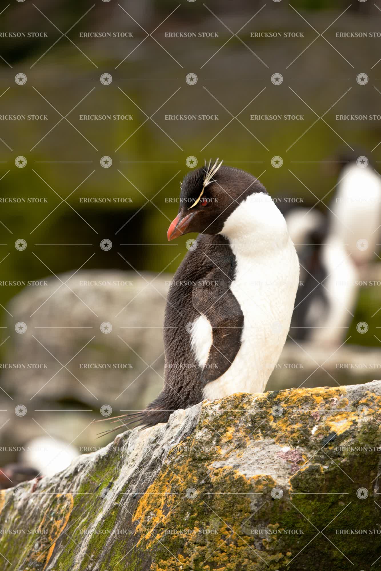 Tags alert, animal, background animal, bird, day, nobody, one animal, outdoor, outdoors, outside, penguin, penguins, rock, rocks, selective focus, vertical, yellow-eyed penguin, yellow-eyed penguins