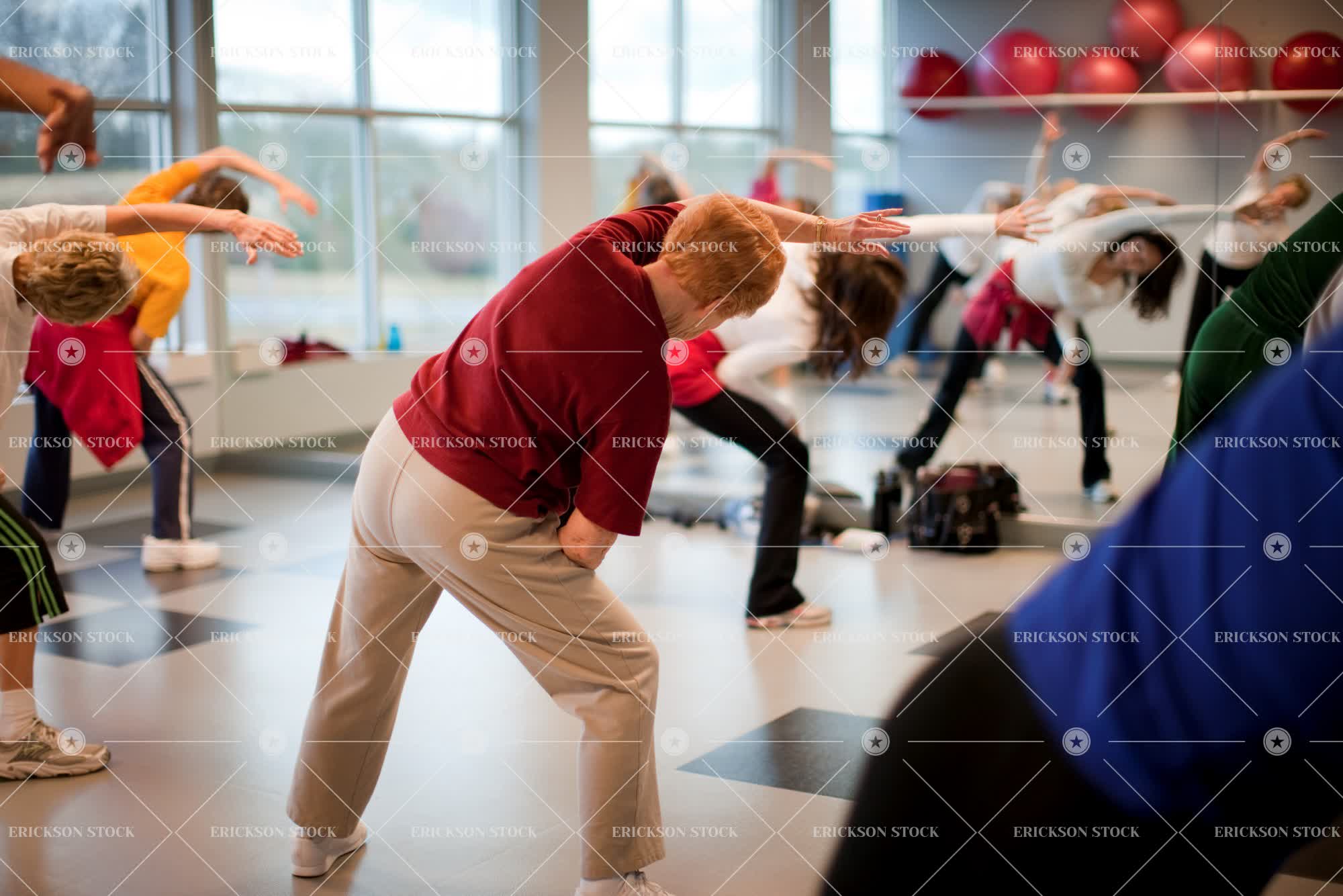 Tags active senior, adult, back, back view, caucasian, class, cropped, day, exercise, exercise class, exercise classes, exercises, exercising, female, fit, fitness, full length, group, gym, gym class, gym classes, gymnasium, gymnasiums, gyms, health, healthy, horizontal, indoor, indoors, inside, leisure, leisure activities, leisure activity, medium group of people, part of, people, person, rear, rear view, recreation, recreational pursuit, recreational pursuits, reflected, reflecting, Reflection, reflections, reflective, retirement, selective focus, senior adult, sport, Sports, stretch, stretches, stretching, vitality, woman