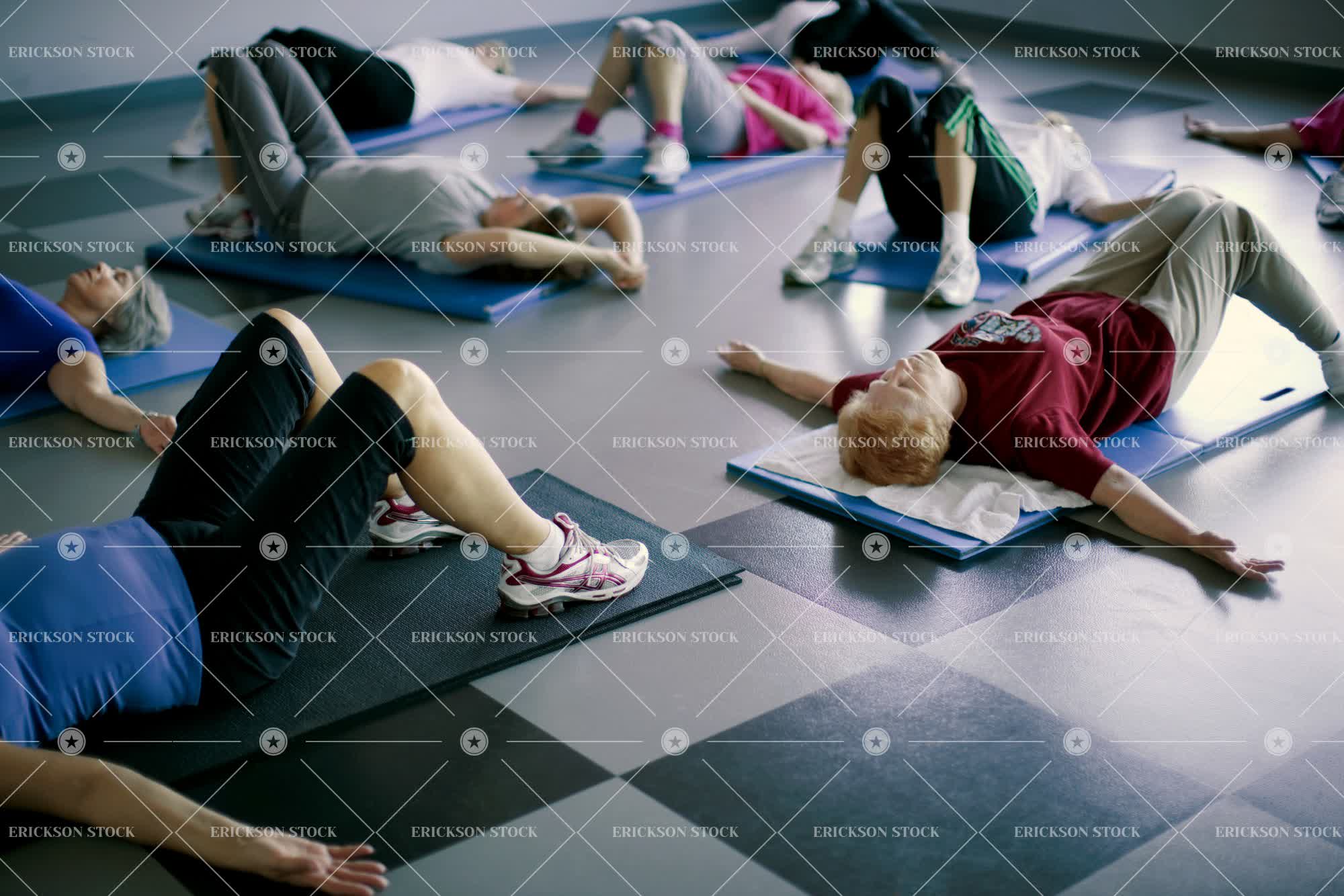 Tags active senior, adult, caucasian, class, cropped, exercise, exercise class, exercise classes, exercises, exercising, female, fit, fitness, full length, group, gym, gym class, gym classes, gymnasium, gymnasiums, gyms, health, healthy, horizontal, indoor, indoors, inside, leisure, leisure activities, leisure activity, lie down, low section, Lying down, medium group of people, part of, people, person, recreation, recreational pursuit, recreational pursuits, relax, Relaxation, relaxed, relaxes, relaxing, retirement, selective focus, senior adult, sport, Sports, stretch, stretches, stretching, three quarter length, vitality, woman