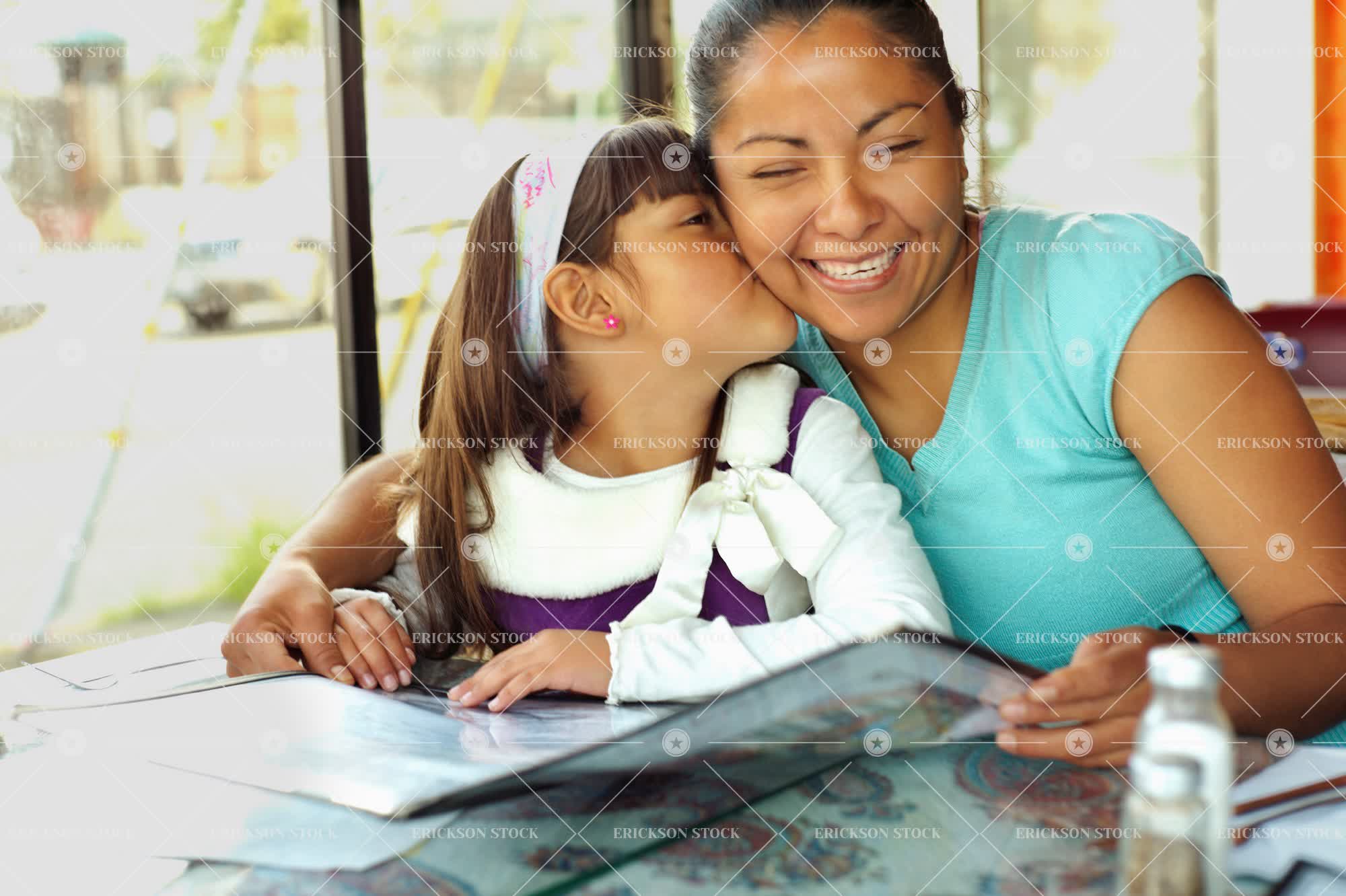 Young girl kisses her mother on the cheek while she looks at a restaurant menu.