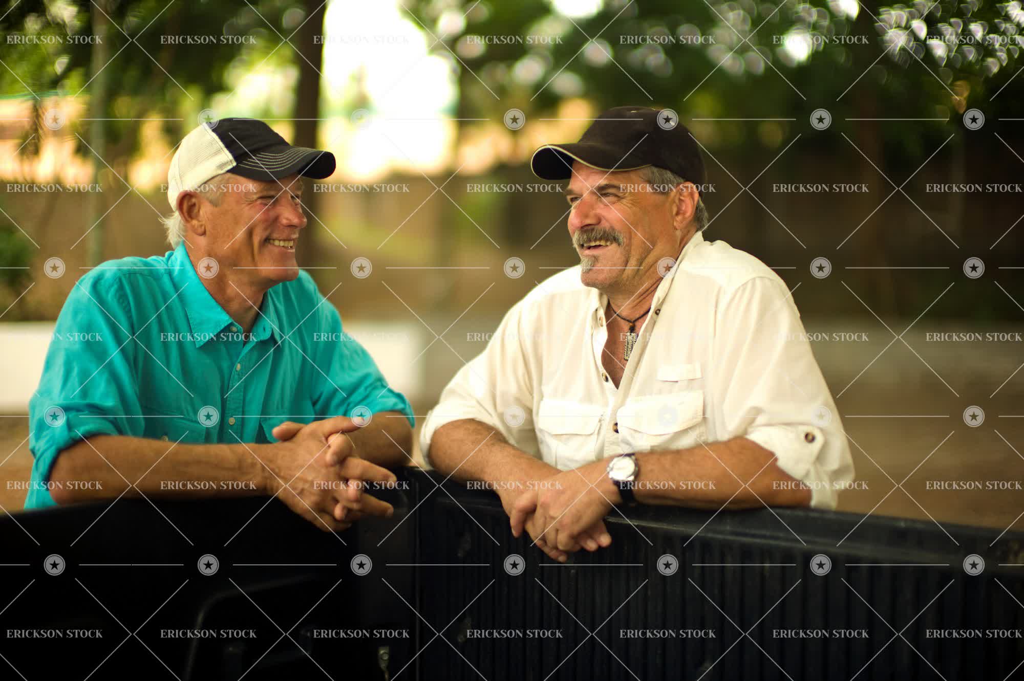 Tags adult, agriculture, baseball cap, cap, caucasian, cheerful, conversation, day, delight, enjoyment, farm, farmer, farmers, farming, farms, half length, happiness, happy, hat, hats, horizontal, joy, joyful, male, man, mature adult, mid adult, outdoor, outdoors, outside, people, person, rural, selective focus, smile, smiling, speak, speaking, speaks, talk, talking, talks, together, togetherness, Tree, trees, two people, waist up