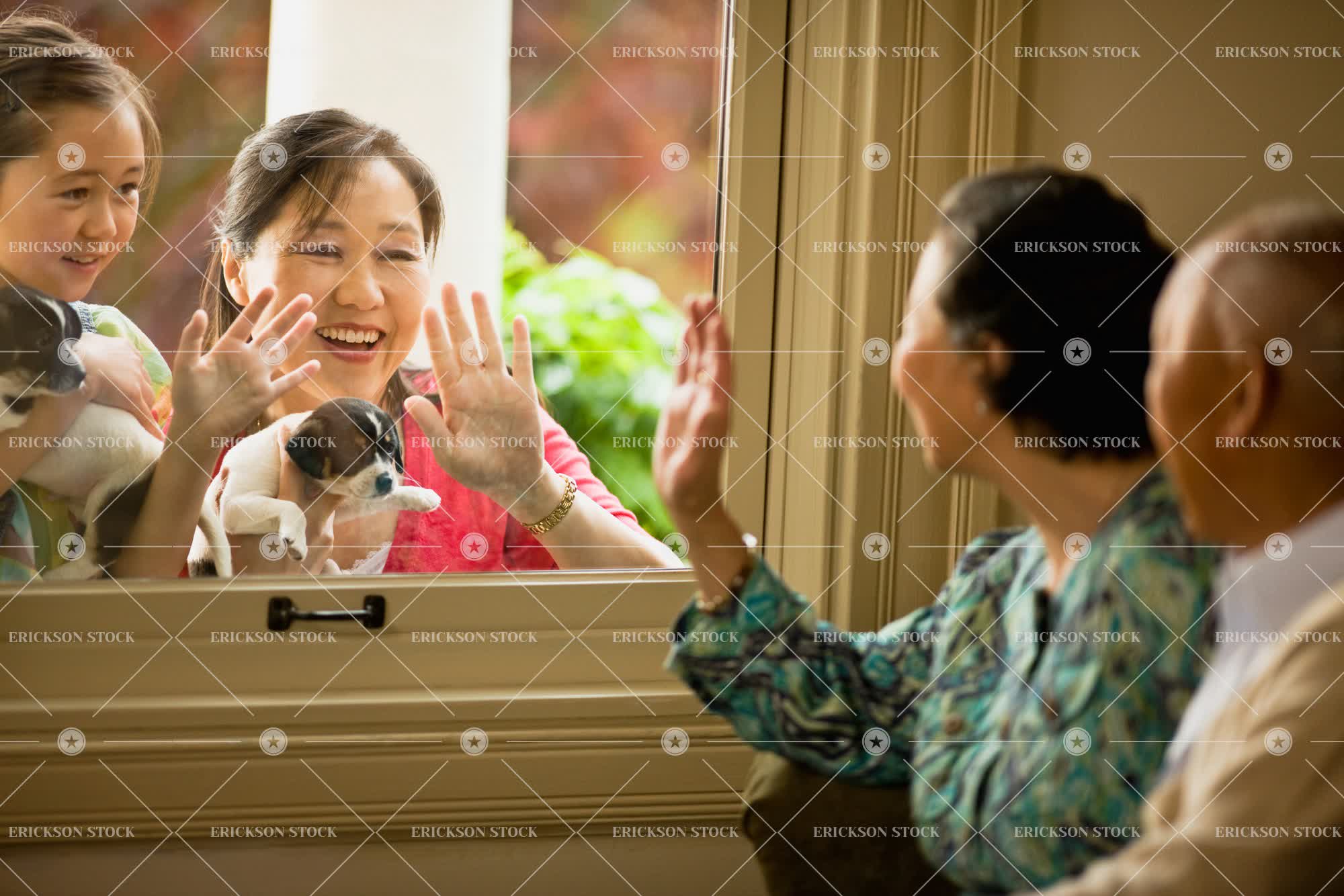 Young girl and her mother hold a puppy each and smile and wave through a window to a senior couple sitting inside.