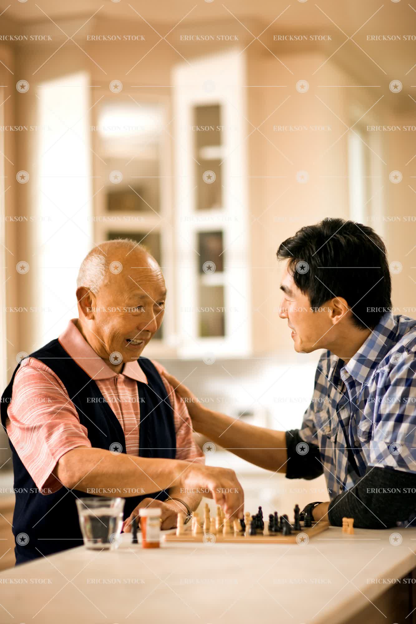 Senior man makes a chess move and his younger opponent puts an affectionate hand on his shoulder as they smile and talk over a chess set while they sit at the end of a kitchen counter.