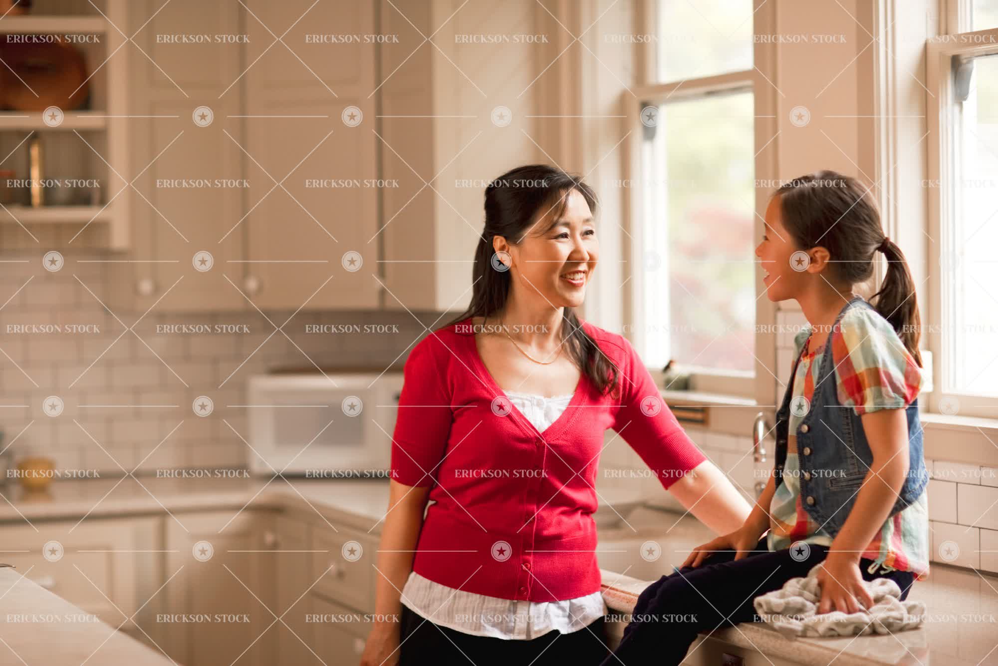 Woman talking in the kitchen with her granddaughter.