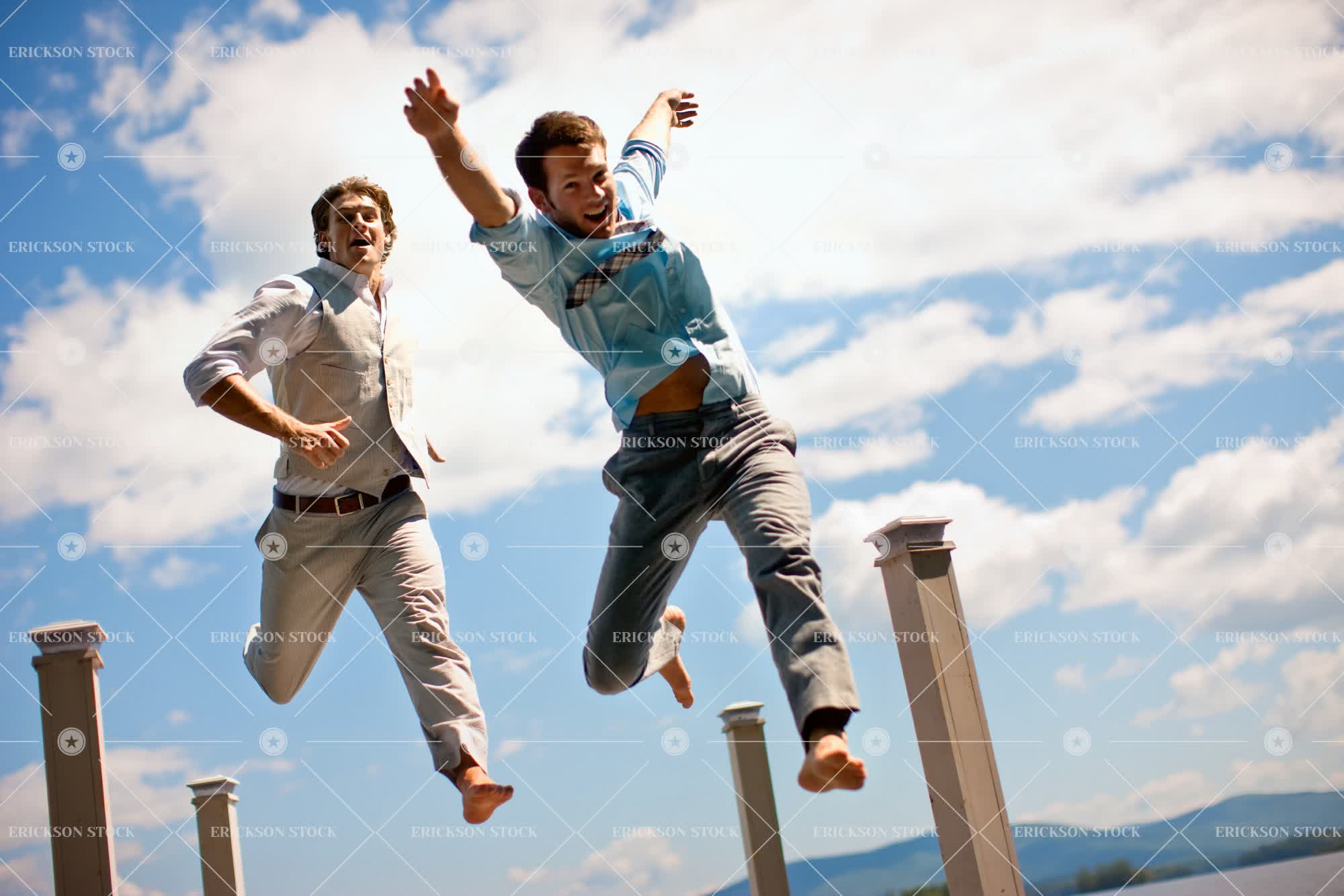 Tags adult, blue sky, carefree, caucasian, cheerful, cloud, copy space, day, delight, enjoyment, excited, excitement, Eye contact, formal, formal wear, formalwear, friend, friends, friendship, full length, Fun, getting away from it all, happiness, happy, having fun, holiday, holidays, horizontal, jetties, jetty, joy, joyful, jump, jumping, jumping for joy, Lake, lakes, leap, leaping, leisure, leisure activities, leisure activity, look at camera, looking at camera, low angle, low angle view, male, man, mid-air, midair, natural, nature, negative space, outdoor, outdoors, outside, people, person, Pier, piers, play, Playful, playfulness, Playing, plays, pond, ponds, recreation, recreational pursuit, recreational pursuits, selective focus, silliness, silly, smile, smiling, teenager, together, togetherness, tourist destination, tourist destinations, travel, travel destination, travel destinations, two people, Vacation, vacations, water, weekend activities, weekend activity, well-dressed, Wharf, wharves, young adult