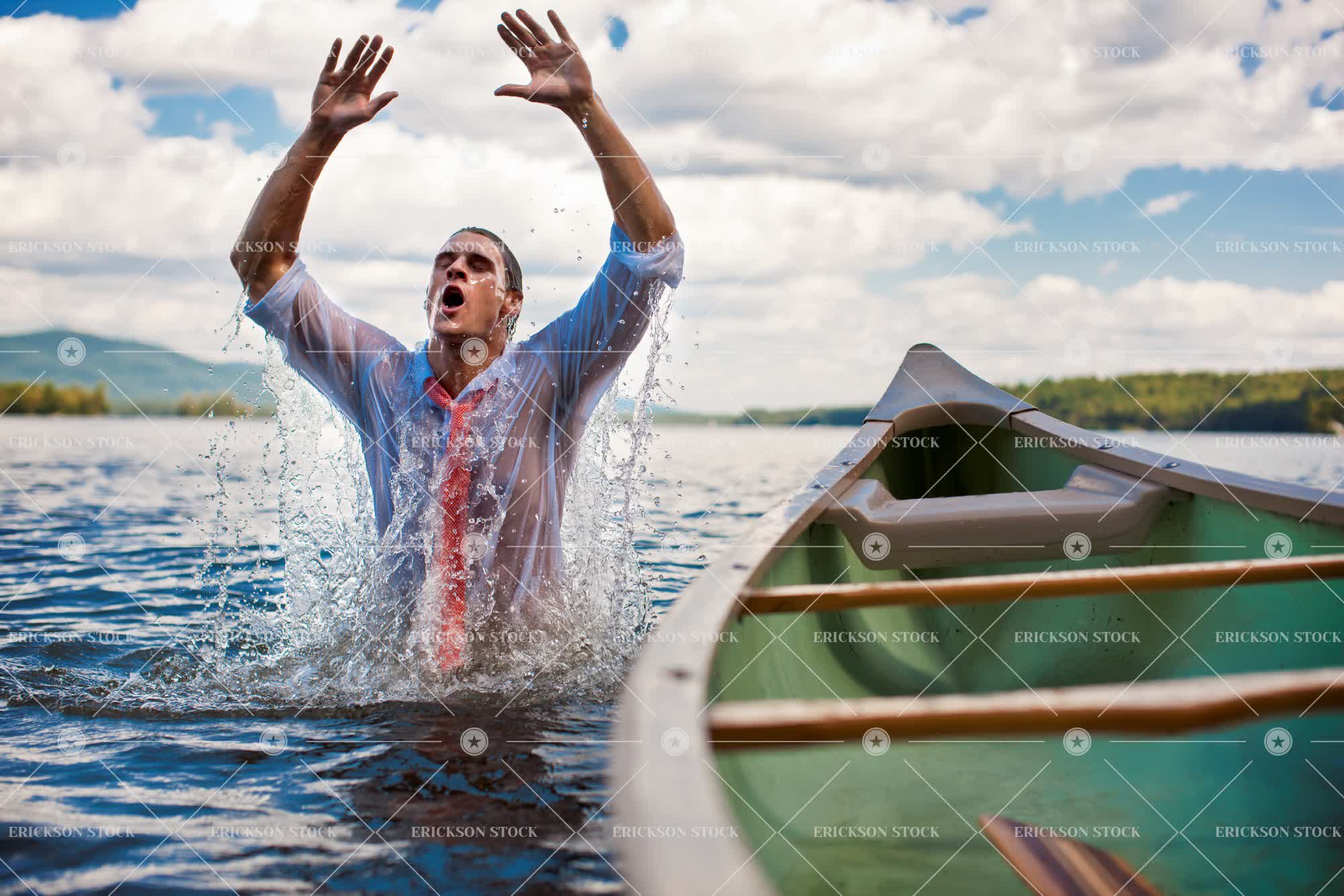 Tags adult, adventure, arm raised, business, business man, button down shirt, canoe, carefree, caucasian, closed eyes, collared shirt, copy space, day, executive, executives, eyes closed, free, freedom, half length, hand raised, hands raised, holiday, holidays, horizontal, Lake, lakes, leisure, leisure activities, leisure activity, male, man, mid adult, natural, nature, negative space, one person, out of context, outdoor, outdoors, outside, people, person, pond, ponds, recreation, recreational pursuit, recreational pursuits, selective focus, shirt, shirt and tie, shirts, sport, Sports, tie, tourist destination, tourist destinations, travel, travel destination, travel destinations, unusual, Vacation, vacations, waist up, water, water sport, well-dressed, wet, wet clothes, wet clothing, wet hair, young adult