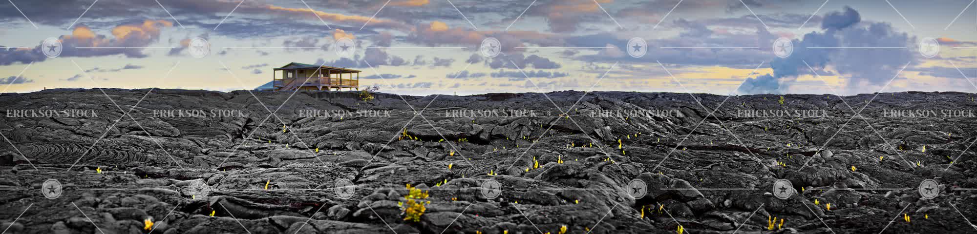 Volcanic rocky landscape with clouds and a house in the background.