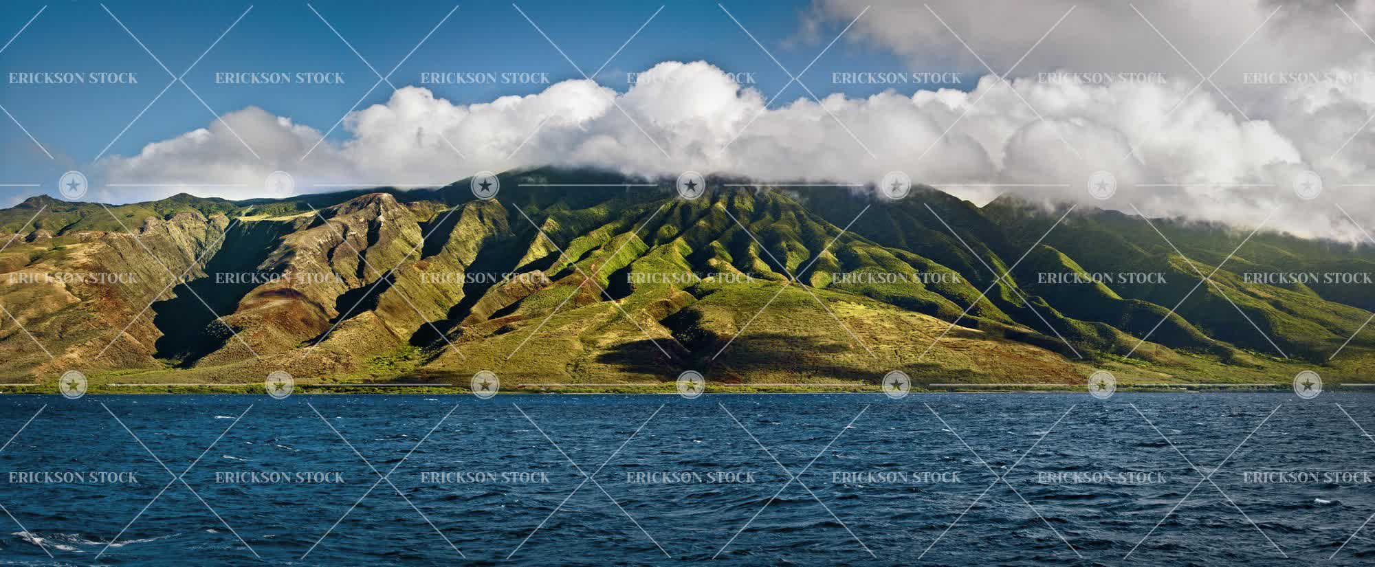 Clouds hovering over a coastline with deep grooves in the landscape.