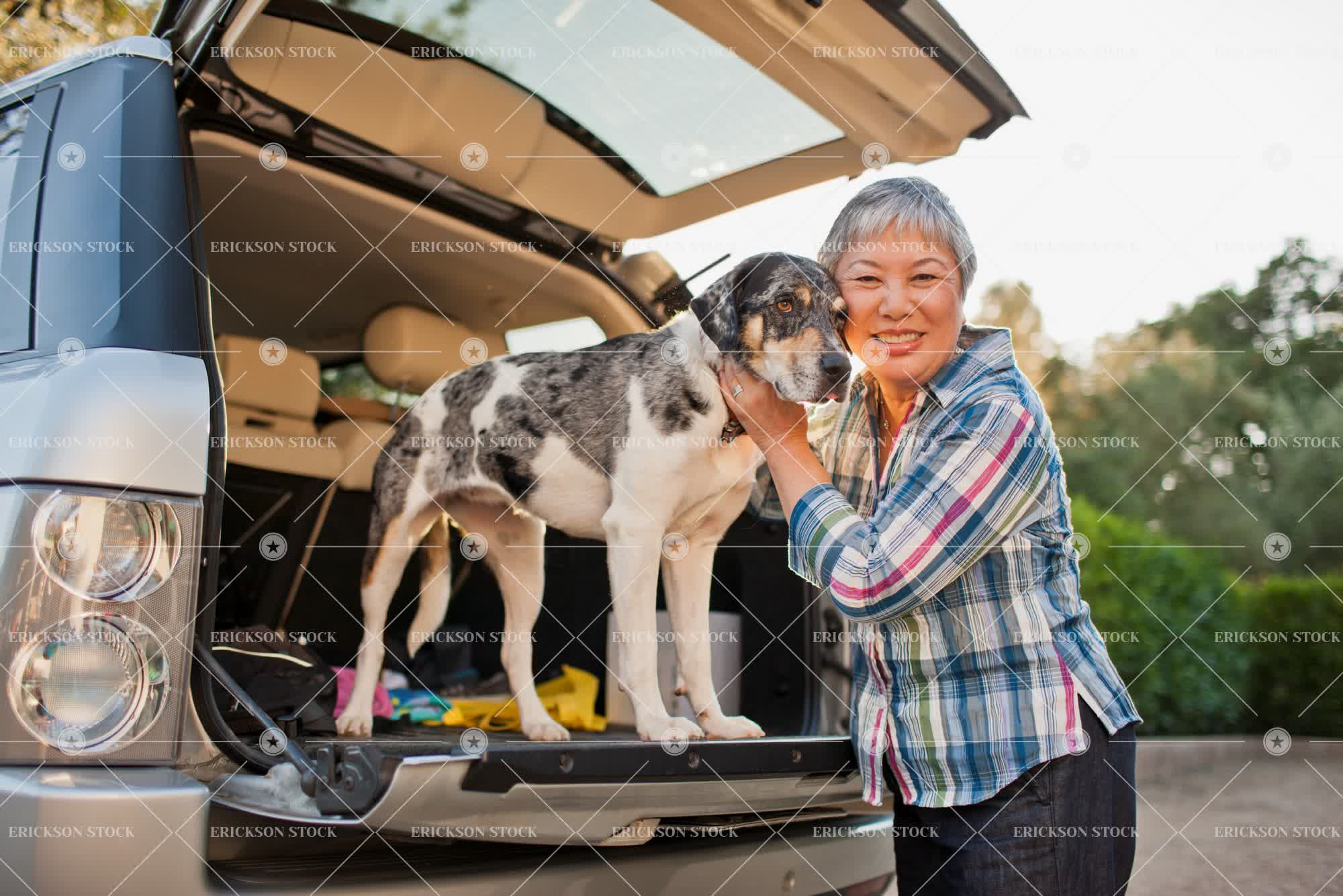 Tags active senior, adult, affectionate, animal, asian, backyard, bond, car, casual clothes, checkered, cheerful, companion, day, delight, dog, domestic, elderly, enjoyment, Eye contact, female, friend, friends, friendship, front or back yard, frontyard, frontyards, Fun, garden, gardens, grass, gray hair, grey hair, half length, happiness, happy, having fun, horizontal, joy, joyful, lawn, leisure, leisure activities, leisure activity, look at camera, looking at camera, love, loving, lumberjack shirt, mature adult, old, one animal, one person, outdoor, outdoors, outside, people, person, pet, pets, plaid shirt, portrait, Portraits, recreation, recreational pursuit, recreational pursuits, residential, residential district, residential districts, retirement, selective focus, senior adult, shirt, shirts, short hair, smile, smiling, sports utility vehicle, sports utility vehicles, Suburb, suburban, suburbia, suburbs, suv, suvs, together, togetherness, transport, Transportation, vehicle, vehicles, vitality, waist up, weekend activities, weekend activity, woman