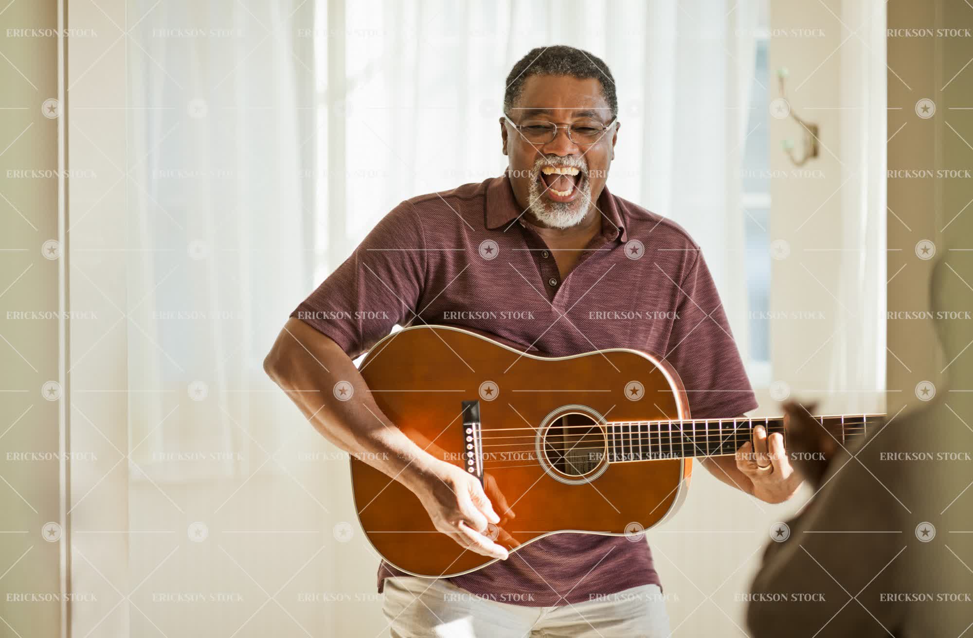 Tags acoustic guitar, active senior, adult, african american, beard, casual clothes, cheerful, delight, enjoyment, eyeglasses, facial hair, Fun, glasses, goatee, goatees, Guitar, guitar player, guitar players, Guitarist, guitarists, guitars, half length, happiness, happy, having fun, hobbies, hobby, hold, holding, holds, home, home interior, home interiors, homes, horizontal, house, house interior, house interiors, houses, indoor, indoors, inside, instrument, instruments, interior, interiors, joy, joyful, leisure, leisure activities, leisure activity, male, man, mature adult, mid adult, mouth open, Music, Musical instrument, musical instruments, Musician, musicians, one person, open mouth, people, person, playing guitar, polo shirt, polo shirts, recreation, recreational pursuit, recreational pursuits, retirement, selective focus, senior adult, smile, smiling, spectacles, stand, standing, stands, vitality, waist up, weekend activities, weekend activity
