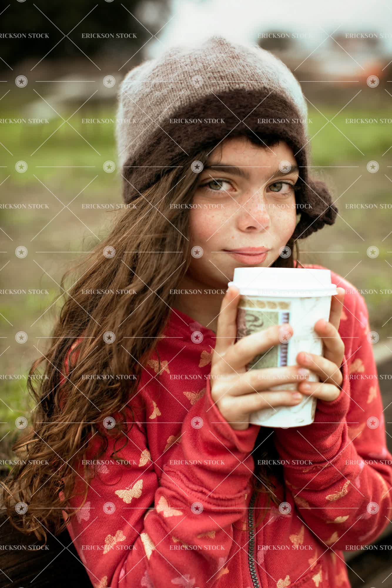 Young girl wearing a knit cap holds a hot drink disposable cup as she poses for a portrait.
