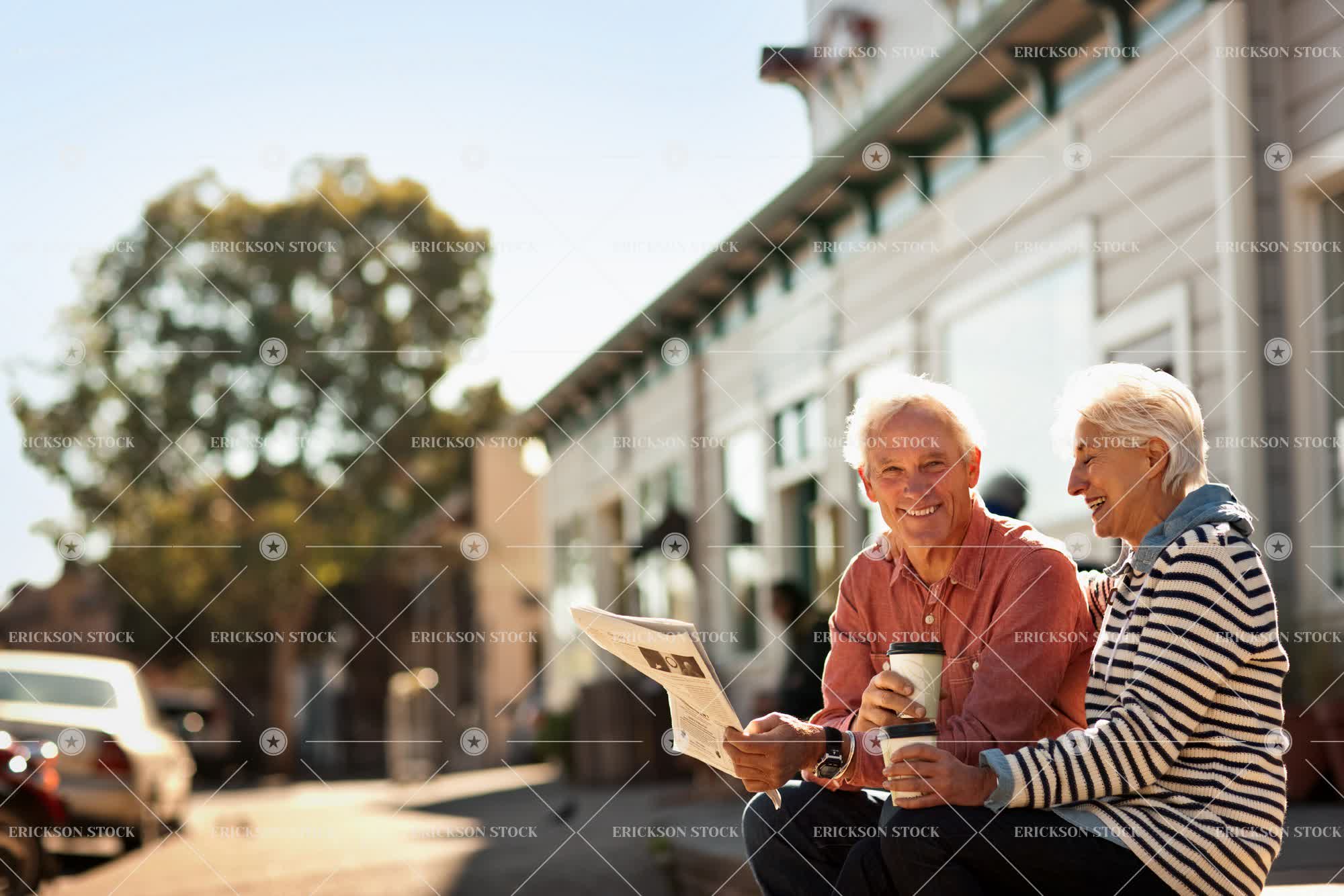 Smiling senior couple sit reading a newspaper and drinking coffee from takeaway cups.