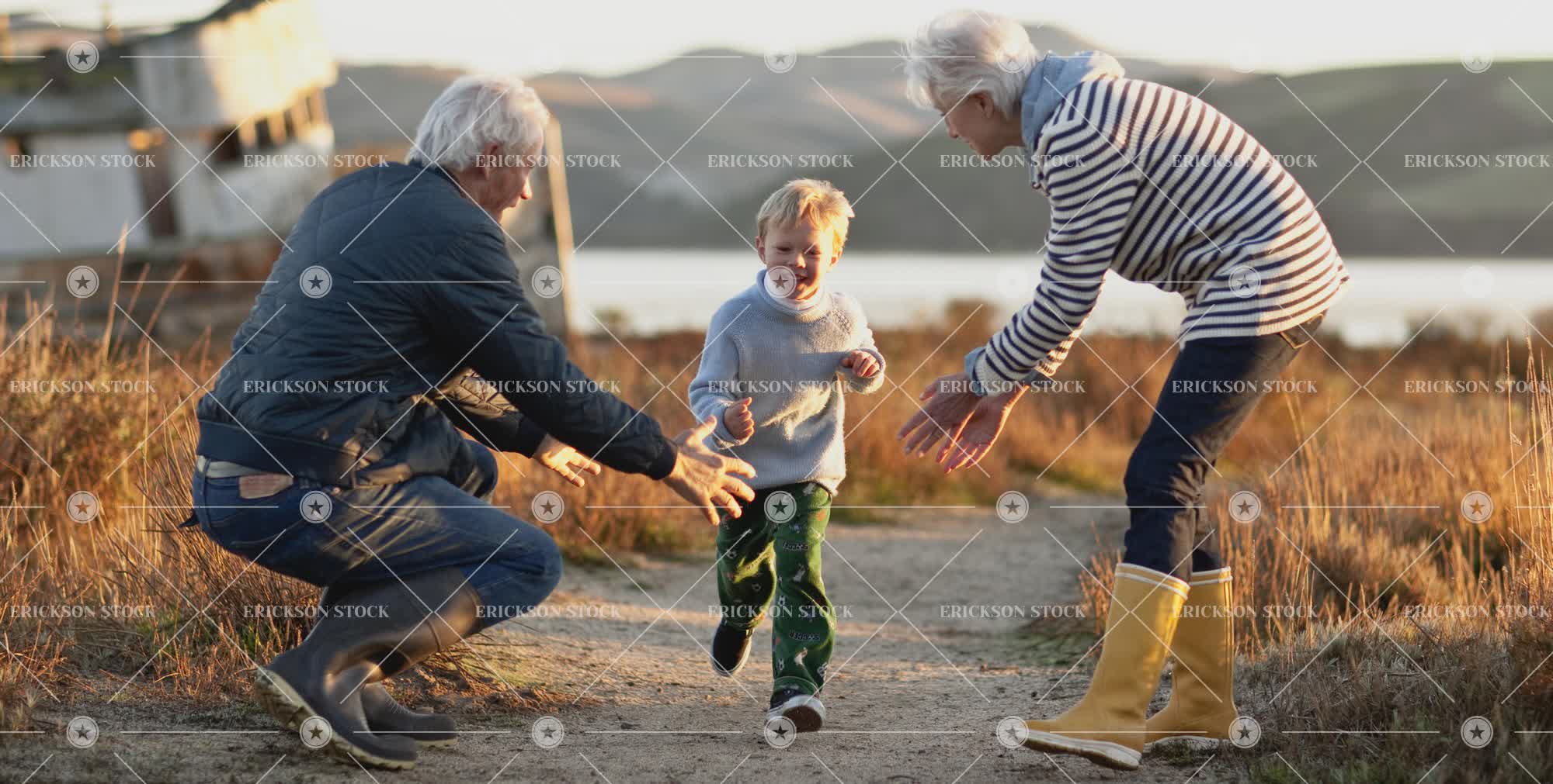 Grandparents anticipating grandson as he runs towards them.
